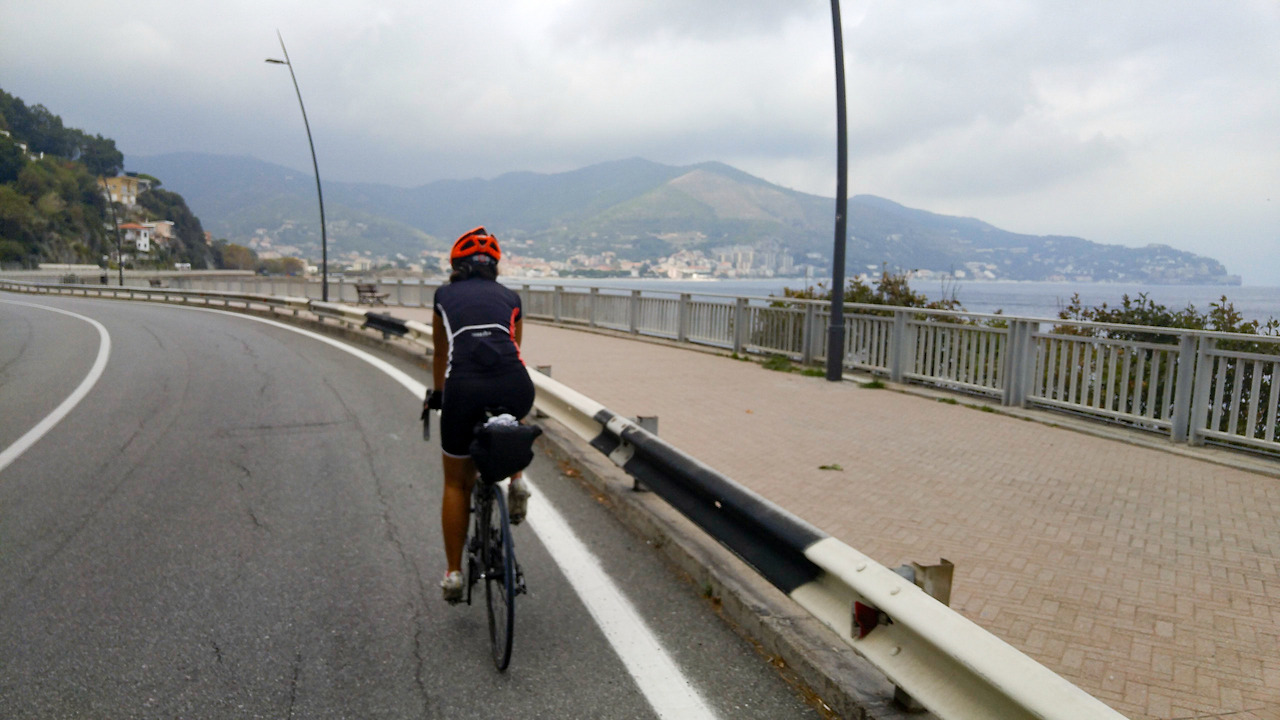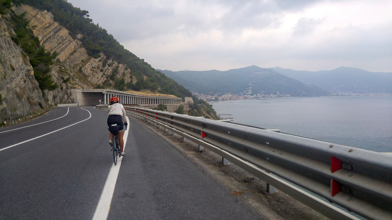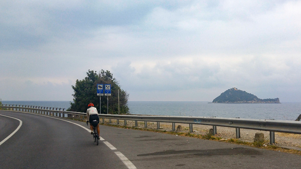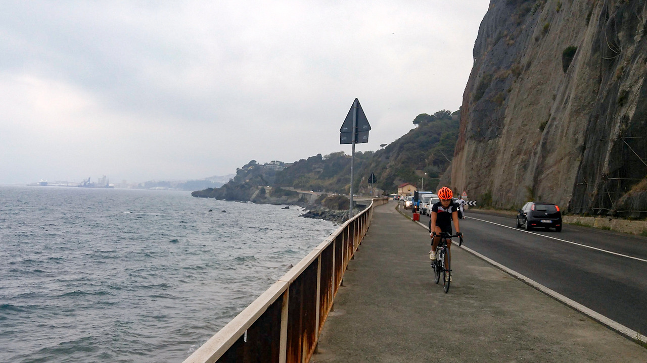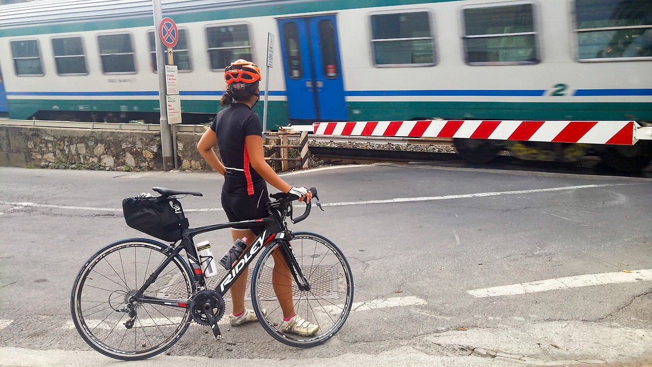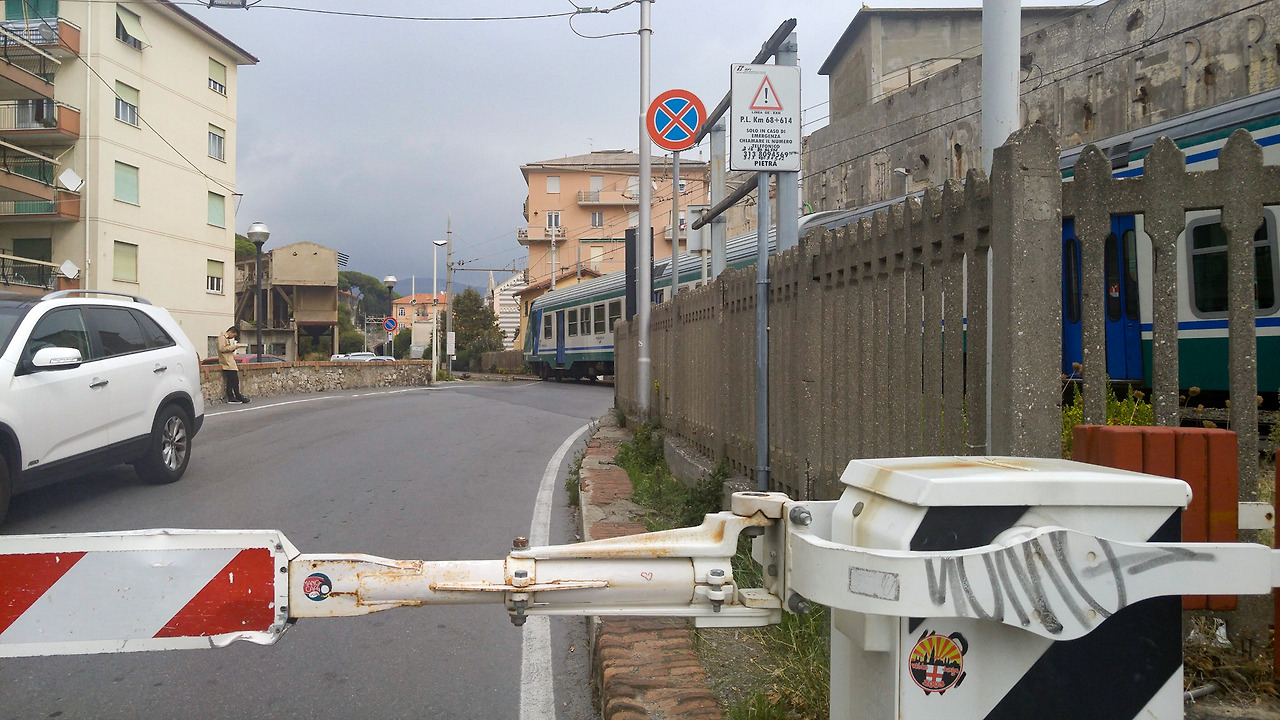 최대한 해변으로 달리려니 기찻길을 피할 수가 없다. 건널목에서 기찻길을 건너야 하는데 계속 기차가 지나가는 때에 걸려서 잠시 멈춘다. 이탈리아는 기차가 지나가는 전후로 넉넉하게 시간을 두고 차단봉을 내려버리기 때문에 한 번 걸리면 꽤 오래 기다려야 한다. 차단봉이 내려오면 얼른 뛰어서 건너버리는 사람들도 있다.