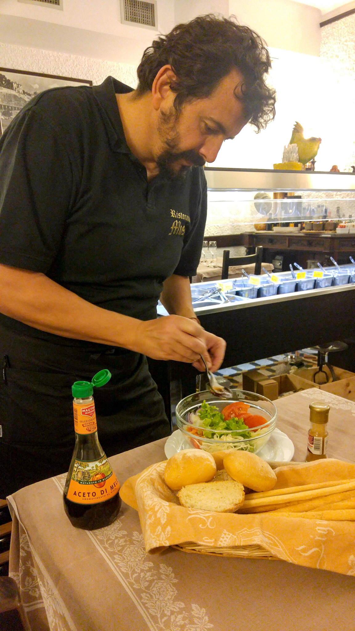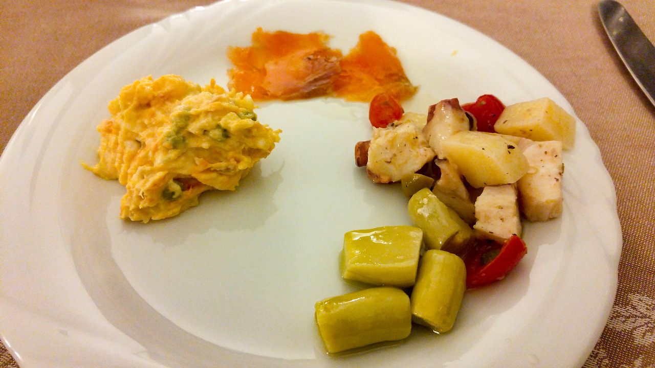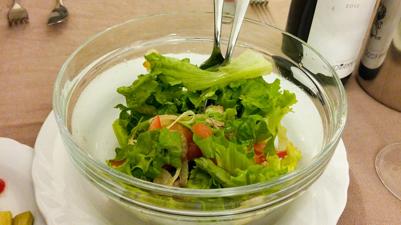 식사와 함께 와인을 주문하려니 와인 리스트에 마침 이탈리아 북부에서 유명하다는 바롤로 와인이 있다. 주문하니 식당 주인인 모세 아저씨가 간단히 디켄팅까지 해서 준다. 이 집은 전채요리를 자기 간단한 샐러드바 형식으로 먹을 수 있는데 우린 주문하지 않고 샐러드를 주문했다. 음식이 나오기 전에 간단히 안주삼아 먹을 수 있도록 주인 아저씨가 샐러드바 음식을 조금씩 담아다 준다. 시골 식당의 이런 마음 씀씀이가 좋다.