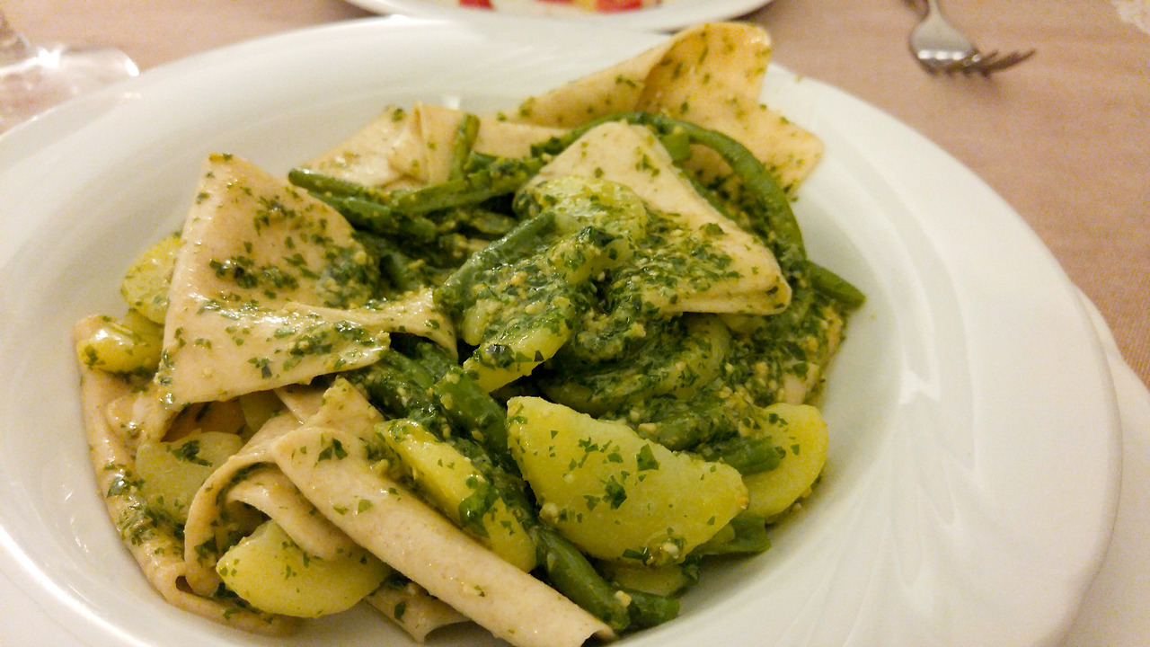 주문한 파스타는 이 지역인 바라체(Varazze) 지역 특산인 만딜리 디 바제(Mandilli de vaze)라는 네모난 수제비같은 파스타다. 바라체의 문장까지 찍혀있는 파스타다. 수제비나 칼국수 같은 식감이 난다.