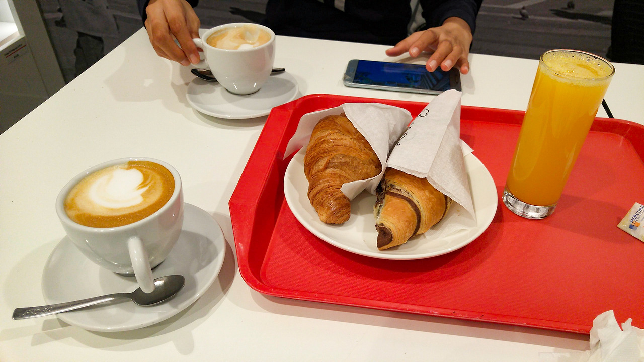 출국 준비를 끝냈으니 간단히 뭘 먹고 싶어서 푸드코트를 헤맨다. 택시비로 남은 현금을 탈탈 털어서 냈는데 하필이면 푸드코트의 카드 결제 시스템이 통째로 안 된다고 한다. 마지막 스파게티를 먹고 싶었는데 마침 푸드코트의 즉석 스파게티 집도 영 이상한 것이 맘에 안 든다. 남은 얼마 안 되는 유로화를 가지고 저렴한 카페를 찾아 앉았다. 다행히 커피와 크로와상 세트도 저렴하고 착즙한 오렌지 주스와 생맥주까지 저렴하다. 가지고 있는 돈에 딱 맞는다.