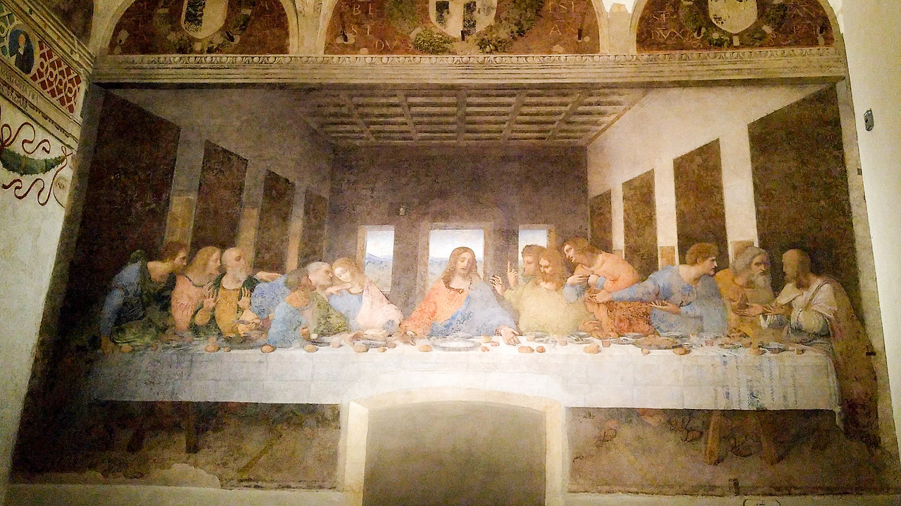 이것이 그 유명한 최후의 만찬이다. 예수님 아래쪽의 까만 부분은 원래 식당 출입구였는데 벽화 보존을 위해 막았다고 한다. 사실 이 벽화는 손상되기 쉬운 템페라 물감으로 그려진 데다가 이미 있는 대로 훼손되어서 대대적인 보수 작업이 시작된 1970년 대에는 이미 형체도 알 수 없는 상태였다고 한다. 새로 덧칠하면서 원본과 얼마나 달라졌을까?