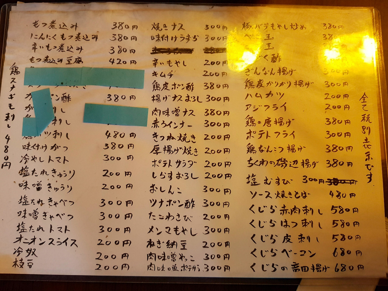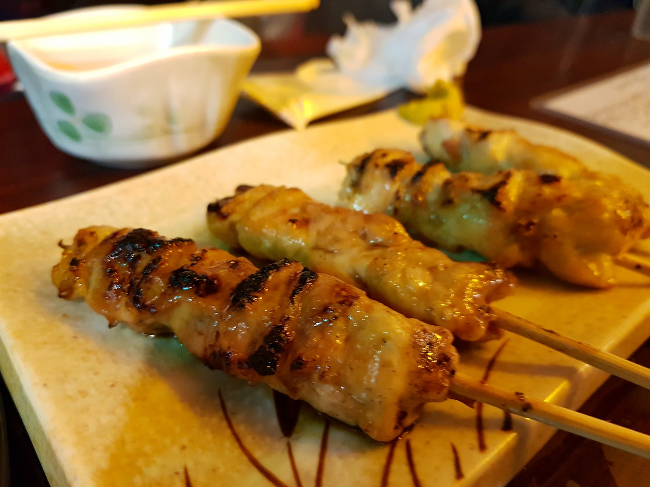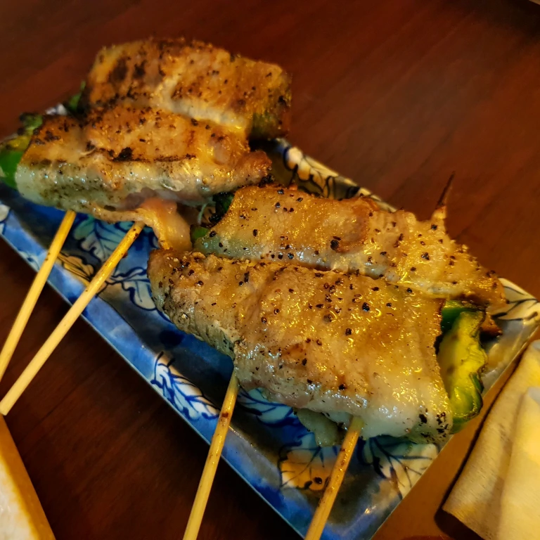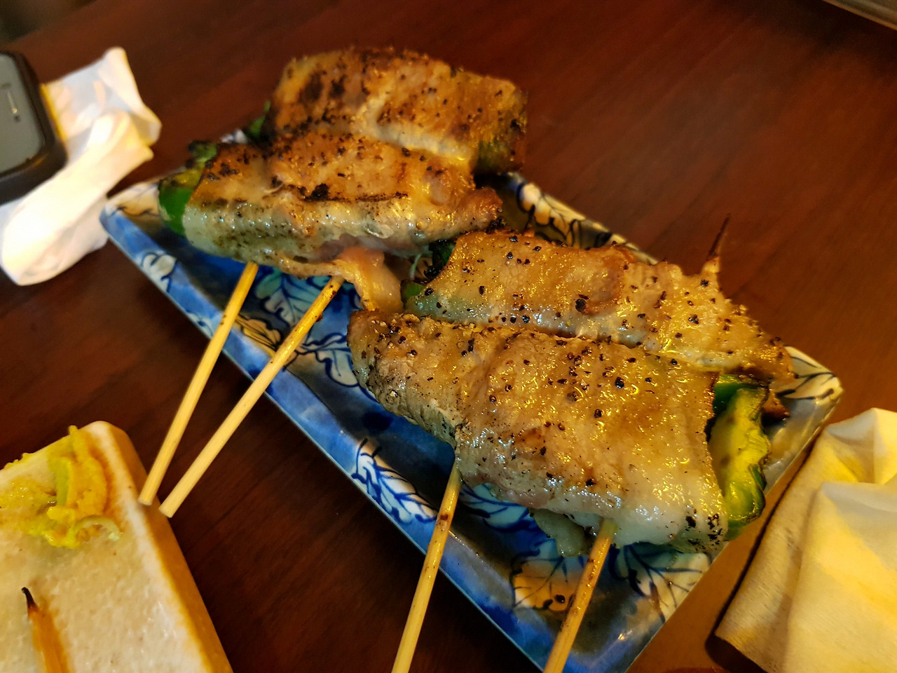 이 집의 특별 메뉴인 돼지고기피망치즈다. 두 개가 꽂혀서 200엔인데 아주 맛있다. 맥주와 꼬치구이에 이것저것 잔뜩 주문해서 배부르게 먹었는데 5000엔 정도 나왔으니 저렴하게 잘 먹었다.