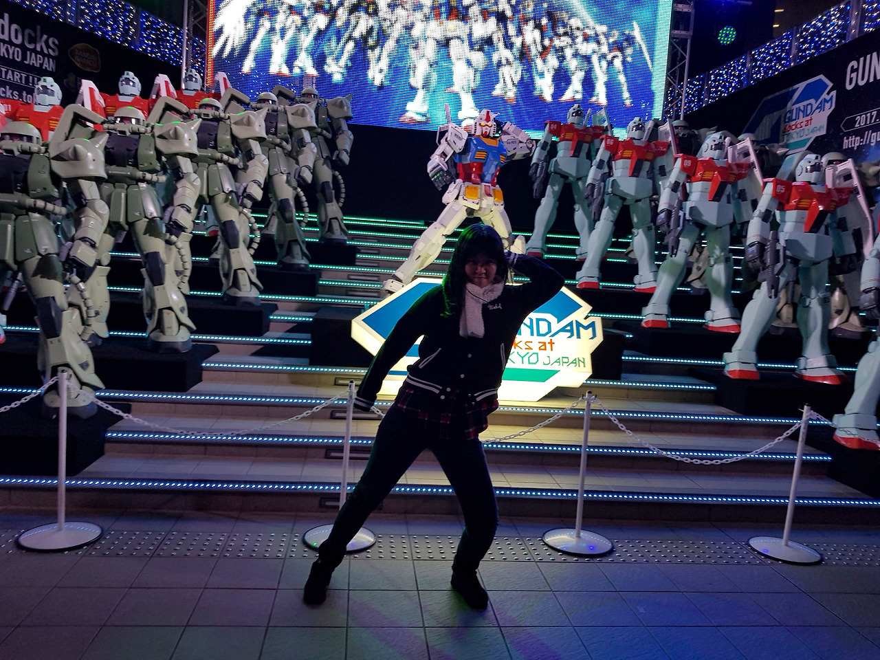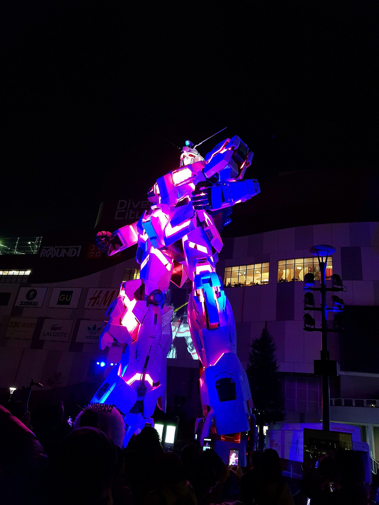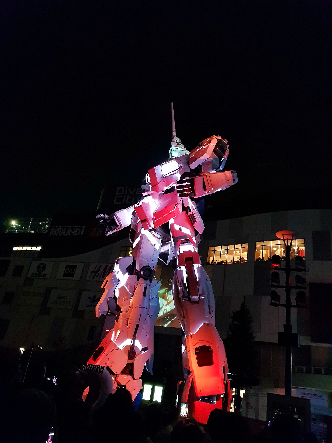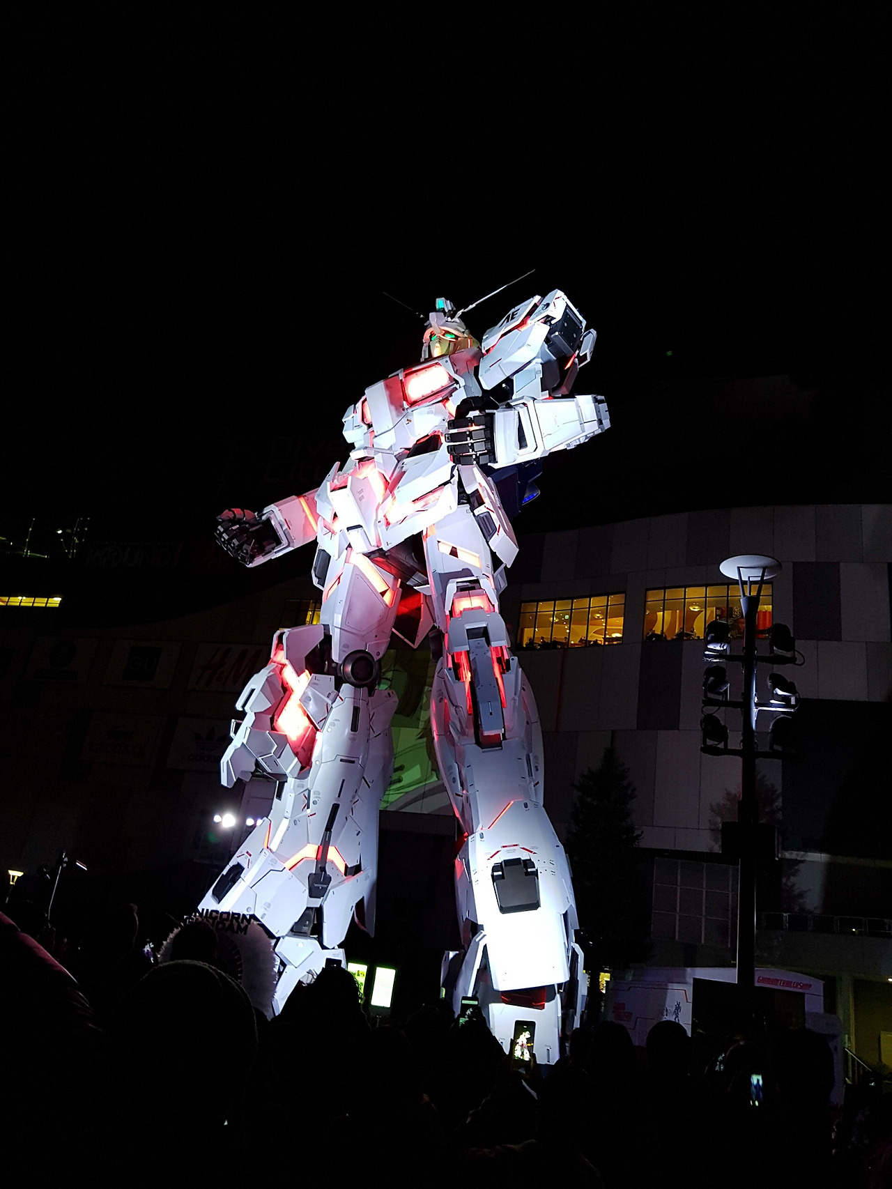 이것 저것 구경하다보니 어느새 정각이 다 되어 가고 거대한 건담 모형 앞에 사람들이 잔뜩 몰려들어 있다. 저녁에 매 시간 정각이 되면 건담 모형이 가동되는 쇼가 시작된다. 가동이라고 해봐야 얼굴 부분이 변형되고 몸 각 부분의 조명이 바뀌는 수준이지만 거대한 로봇의 형상이 화려하게 빛난다. 건담 뒤의 건물벽의 대형 스크린에서 유니콘 건담 애니메이션의 주요 장면이 펼쳐지고 그 장면에 맞춰서 유니콘 건담이 작동을 한다. 시리즈를 대충은 알고 있는 나는 물론 건담을 전혀 모르는 지니님도 볼만한 광경이다.