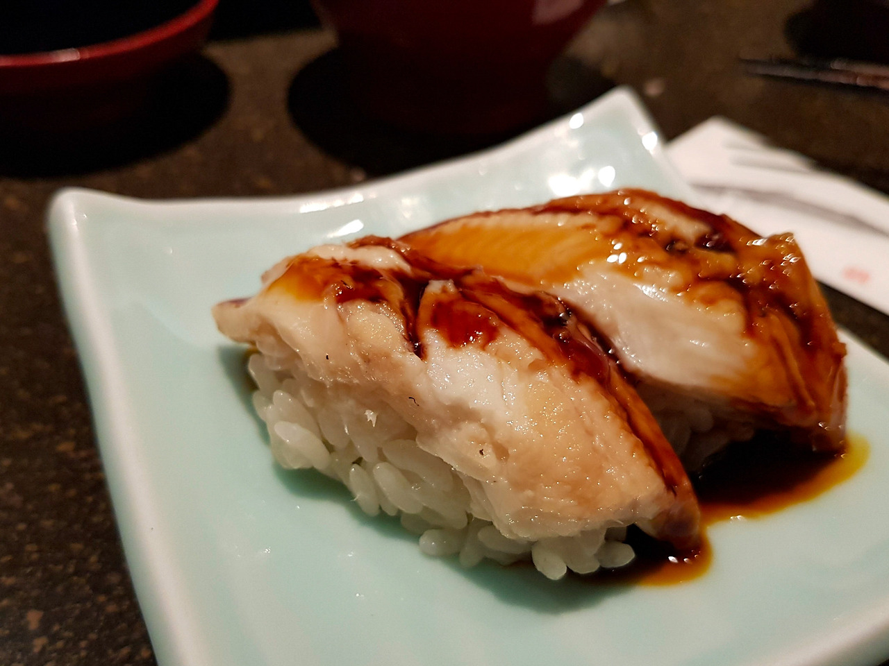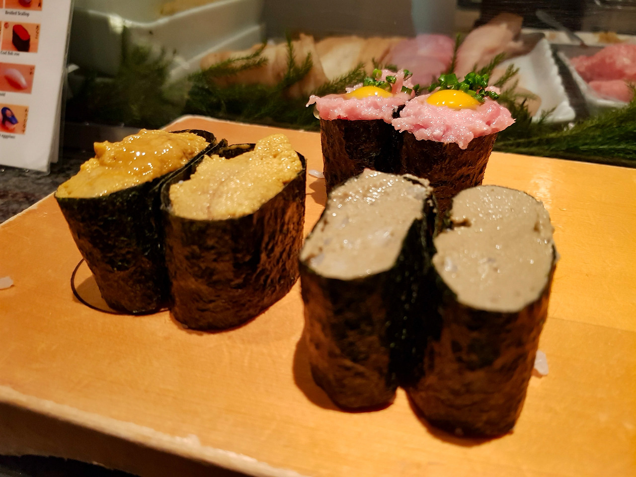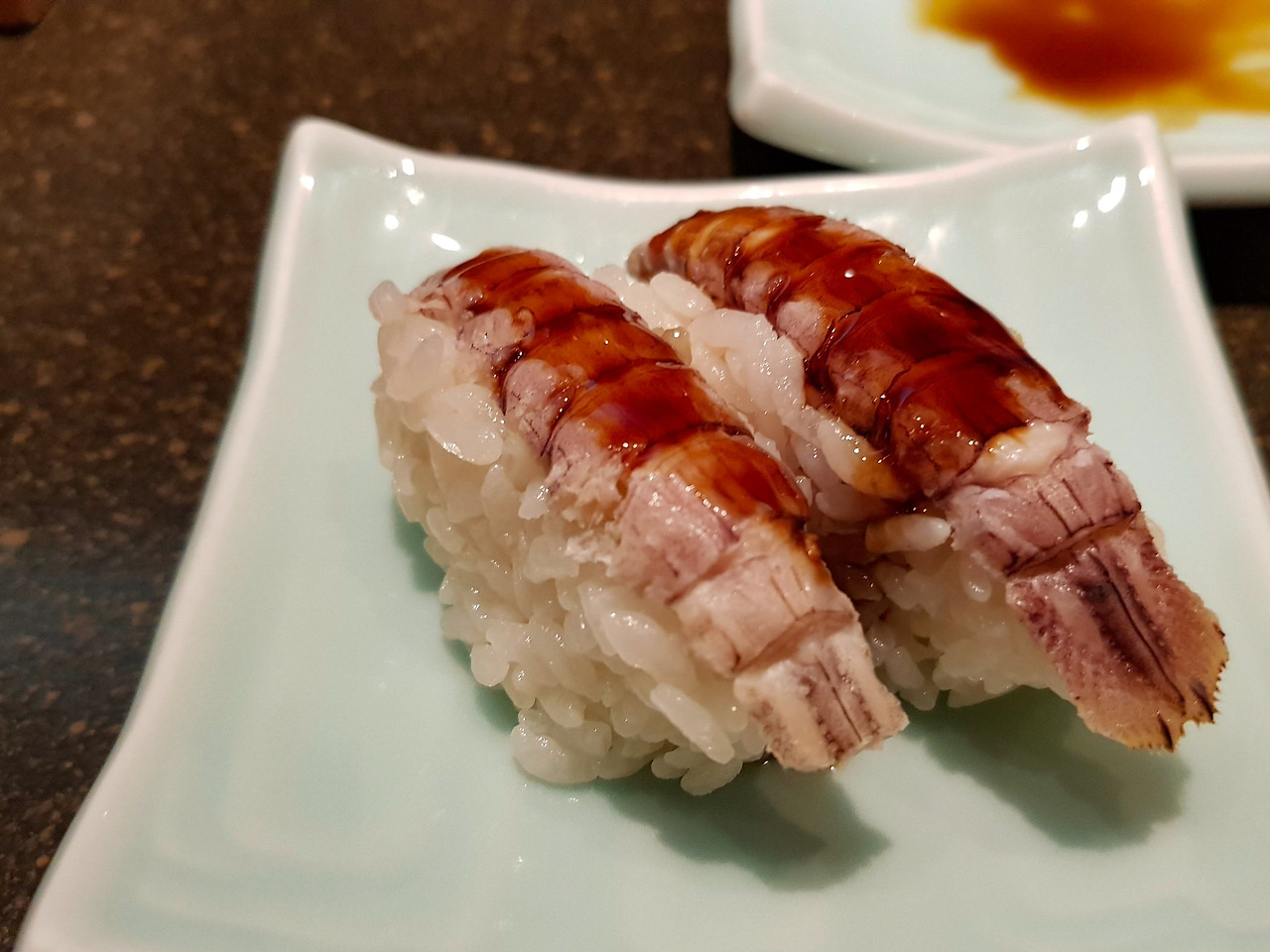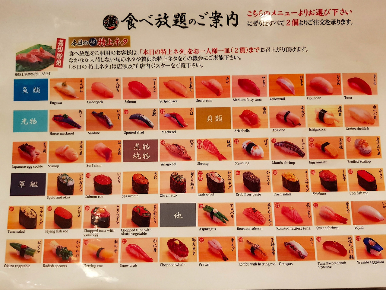 무한 리필은 여기 있는 초밥들을 세 종류 6피스 씩 주문해서 먹을 수 있다. 마구 주문하는 것이 아니라 순서대로 한 명씩 주문을 받고 바로 초밥을 쥐어주면 먹으면서 다음 차례에 무얼 먹을지 골라놓는다. 옆의 4인 가족들과 번갈아 가면서 주문을 한다. 여기 나온 재료 외에 오늘의 특상 재료로 만든 초밥은 한 번 주문할 수 있는데 오늘은 아귀였다. 우리나라에서는 거의 찜으로만 먹을 수 있는 생선을 초밥으로 먹다니...