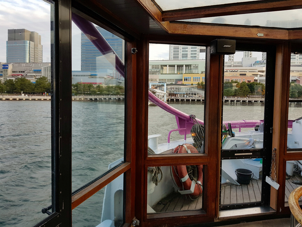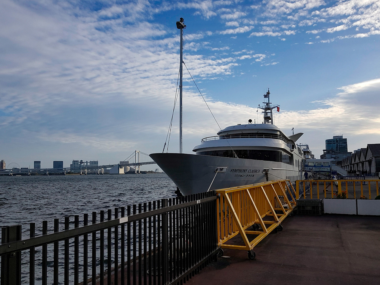 히노데라는 곳에 도착하면 우리가 타고 왔던 배는 다시 아사쿠사로 돌아간다. 여기서 조금 기다려서 오다이바로 가는 배를 타야 한다. 승선권은 이미 아사쿠사에서 오다이바까지 가는 표로 구입했기 때문에 대합실에서 기다렸다가 시간 맞춰 오다이바행 배를 타면 된다. 근처에 심포니라는 크루즈가 있어서 가봤더니 기념 사진도 찍을 수 있었다.