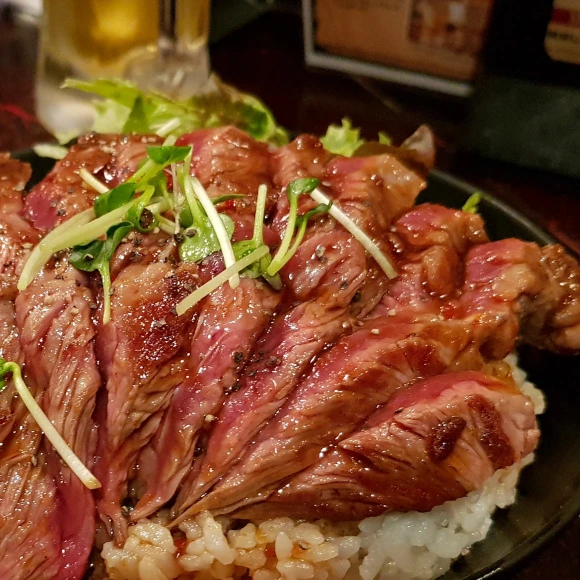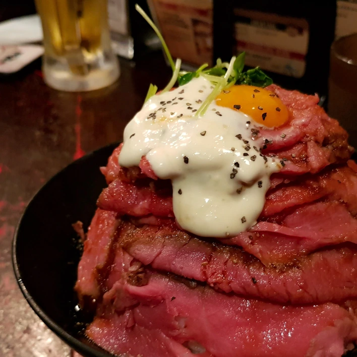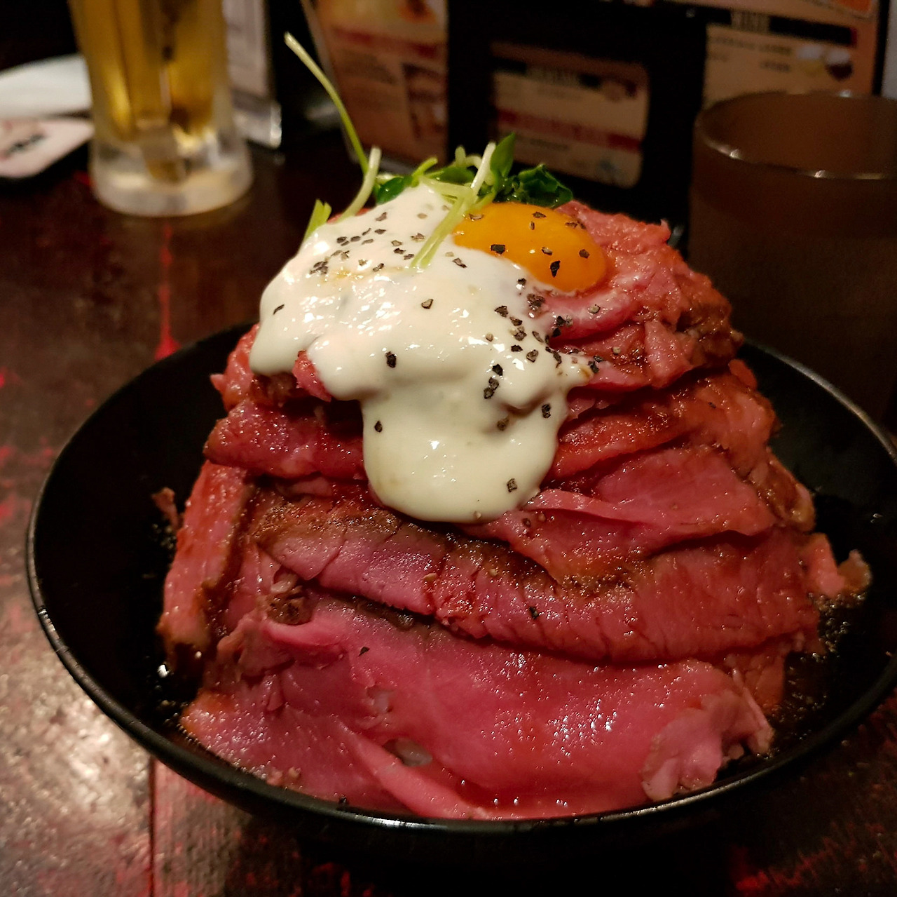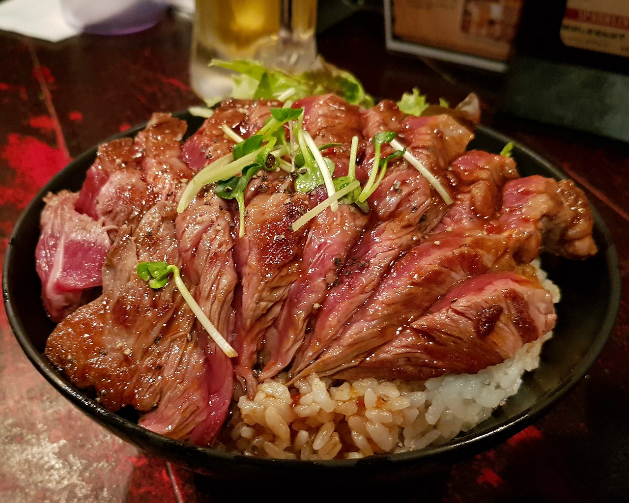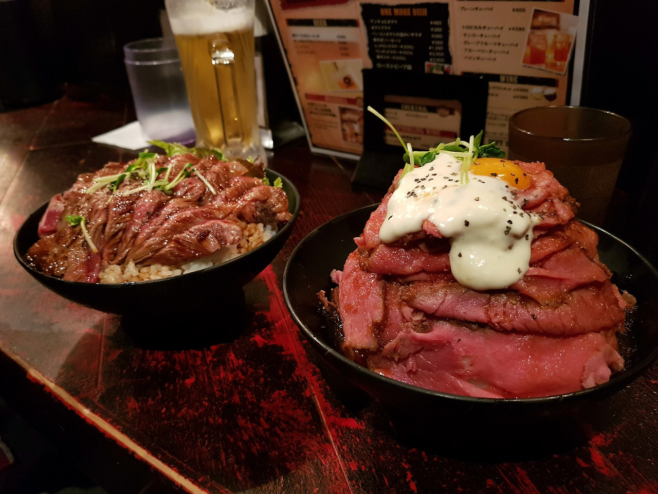 드디어 스테키동(좌)과 로스트비프동(우)이 나왔다. 그릇이 크지는 않지만 생긴 것부터 범상치 않은 고깃덩이들이 잔뜩 올라가 있어 꽤 맛있는고 양도 나쁘지 않았다. 반찬으로 먹을 야채 종류가 없어 약간 느끼할 수 있으니 생맥주도 한 잔씩 마신다.