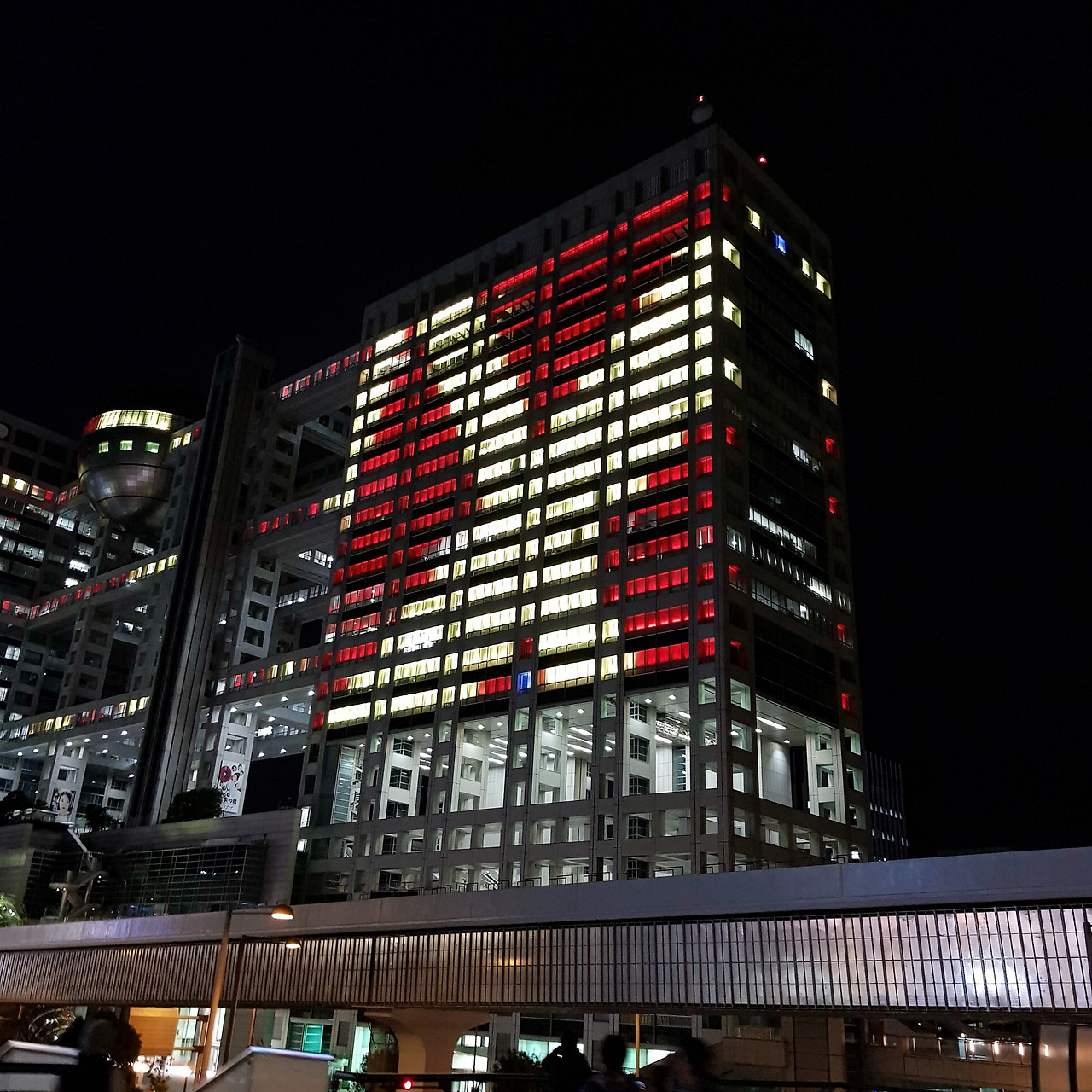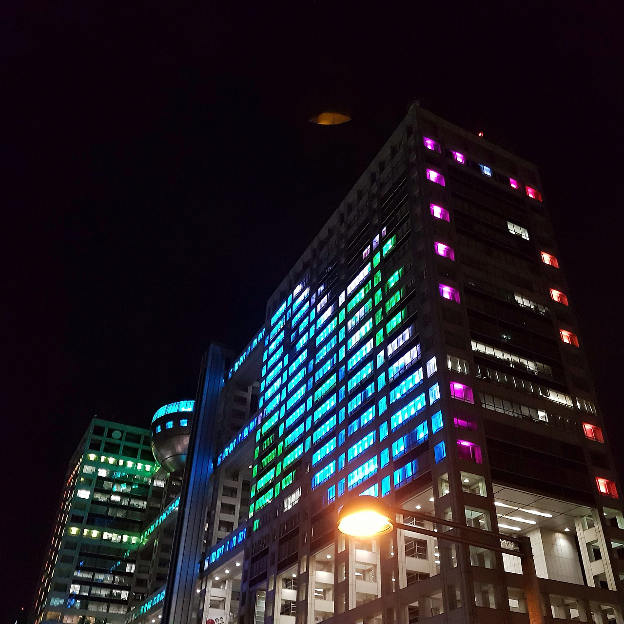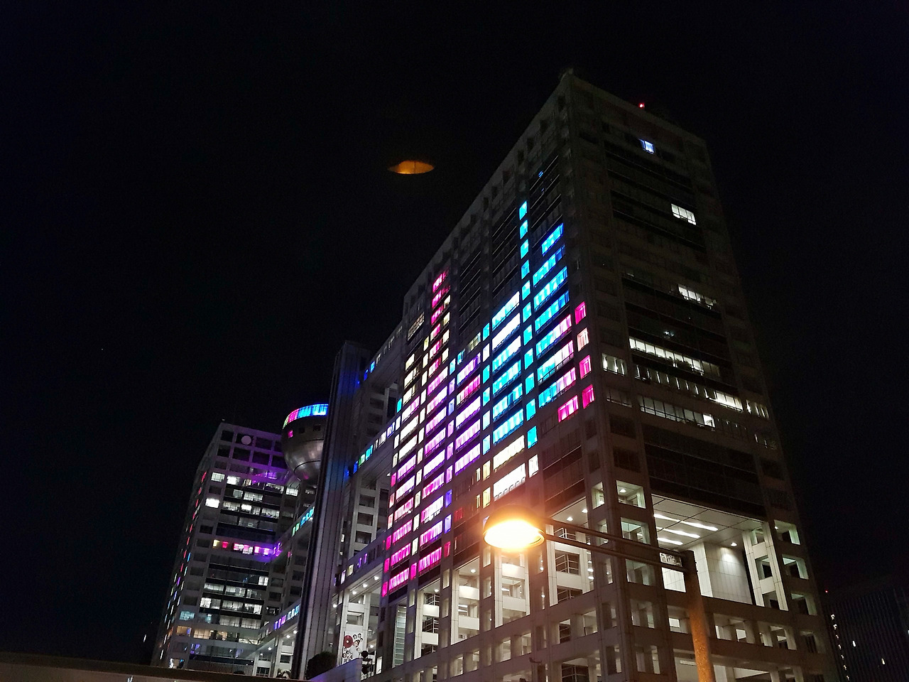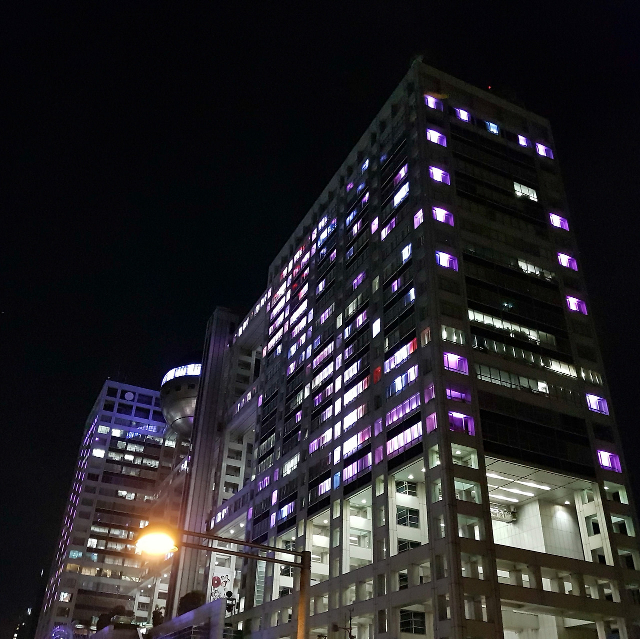 해가 저물면 후지테레비 건물에서는 매 시간마다 화려한 조명쇼를 한다. 건물에 동그란 공 같은 걱이 달려 있는데 하치타마라는 전망대라고 한다.