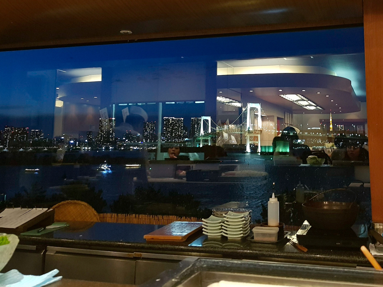 도쿄만 레인보우 브릿지의 풍경을 즐기면서 먹는 초밥이다.