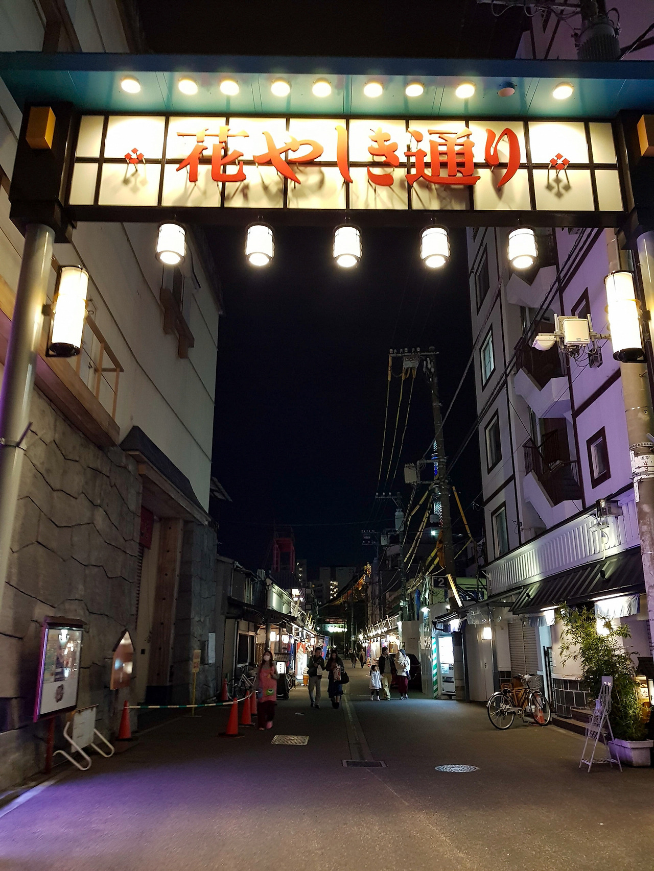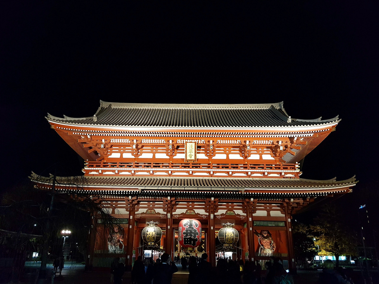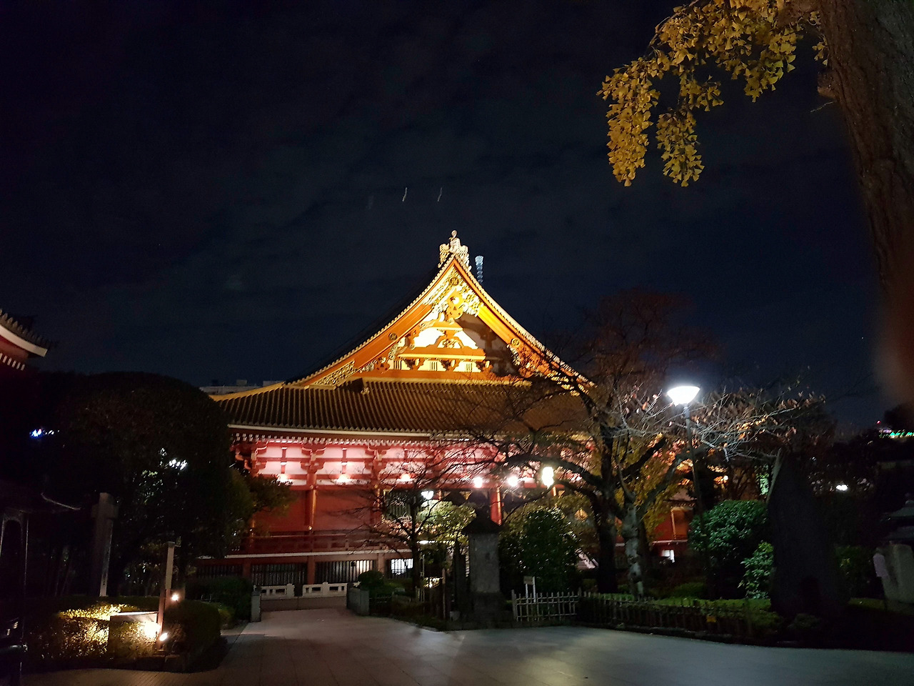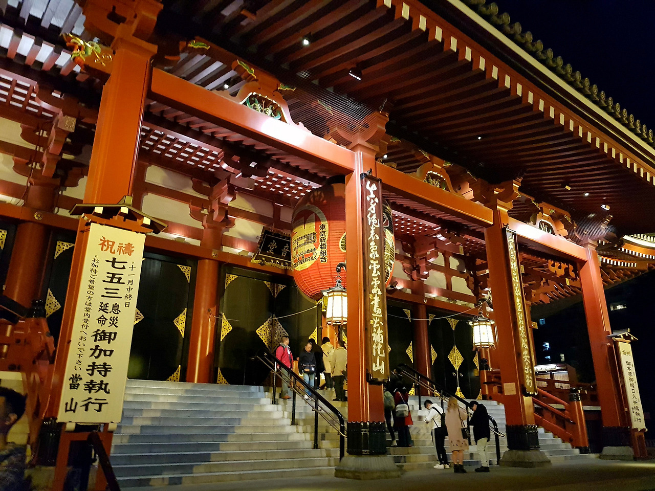 하나야시키길을 쭉 걸어가면 센소지가 나온다. 밤이지만 조명으로 건물을 환하게 비춰서 그리 어둡지 않다. 센소지는 바로 근처에 있는 스미다강에서 어부 형제가 던져 놓은 그물에 걸린 관음상을 모시기 위해 지은 사당에서 시작되었다고 한다. 센소지(浅草寺)의 센소(浅草)는 한자를 일본 발음으로 읽는 음독으로 한문을 읽은 것이고 뜻을 풀어서-훈독으로- 읽으면 이 동네의 이름인 아사쿠사(浅草)가 된다.