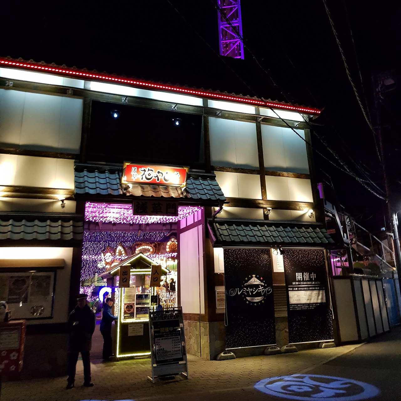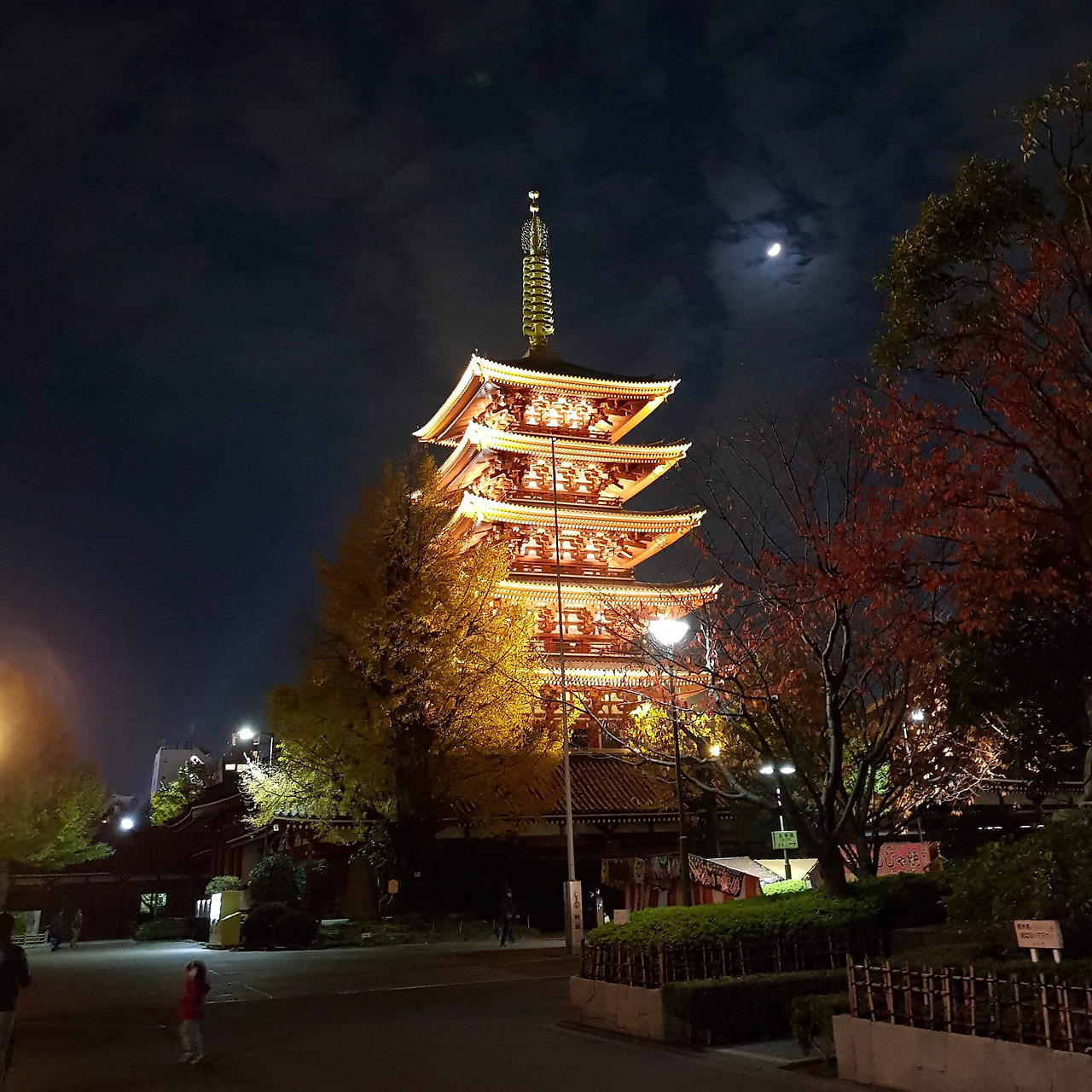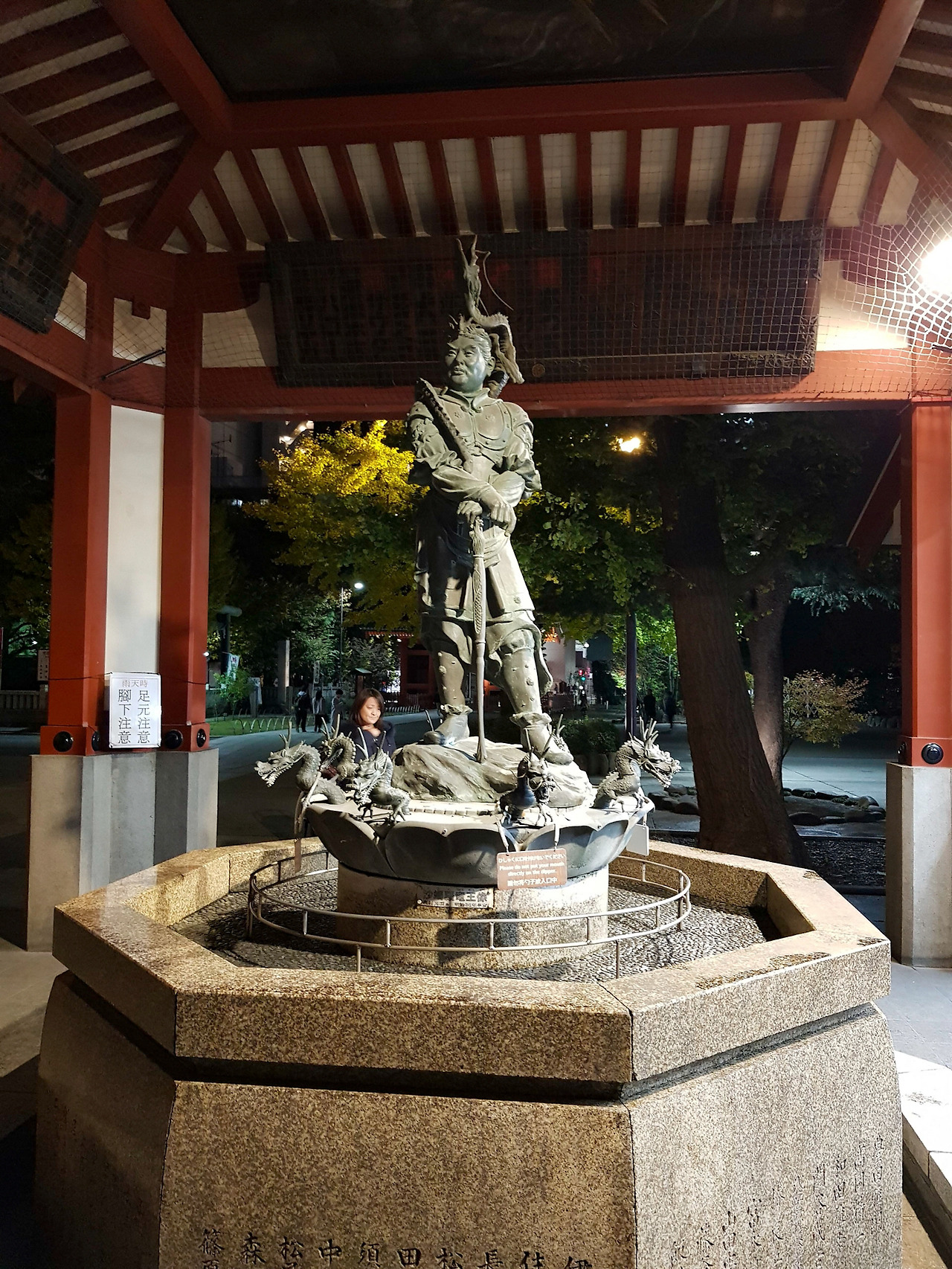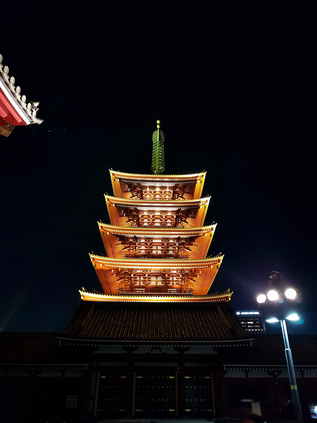 하나야시키길을 쭉 걸어가면 센소지가 나온다. 밤이지만 조명으로 건물을 환하게 비춰서 그리 어둡지 않다. 센소지는 바로 근처에 있는 스미다강에서 어부 형제가 던져 놓은 그물에 걸린 관음상을 모시기 위해 지은 사당에서 시작되었다고 한다. 센소지(浅草寺)의 센소(浅草)는 한자를 일본 발음으로 읽는 음독으로 한문을 읽은 것이고 뜻을 풀어서-훈독으로- 읽으면 이 동네의 이름인 아사쿠사(浅草)가 된다.