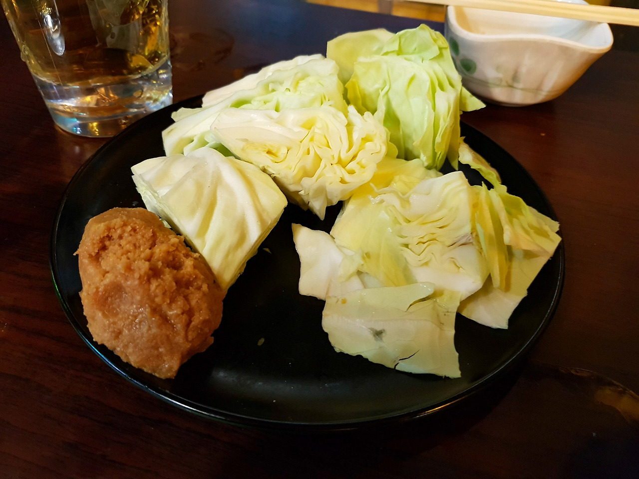 미소캬베츠(된장 양배추)를 주문했더니 말 그대로 된장과 양배추가 나왔다. 소화가 잘 되는 구성인데다가 오늘 하루 종일 먹은 음식들에 야채가 부족했으니 특히 먹을만하다.
