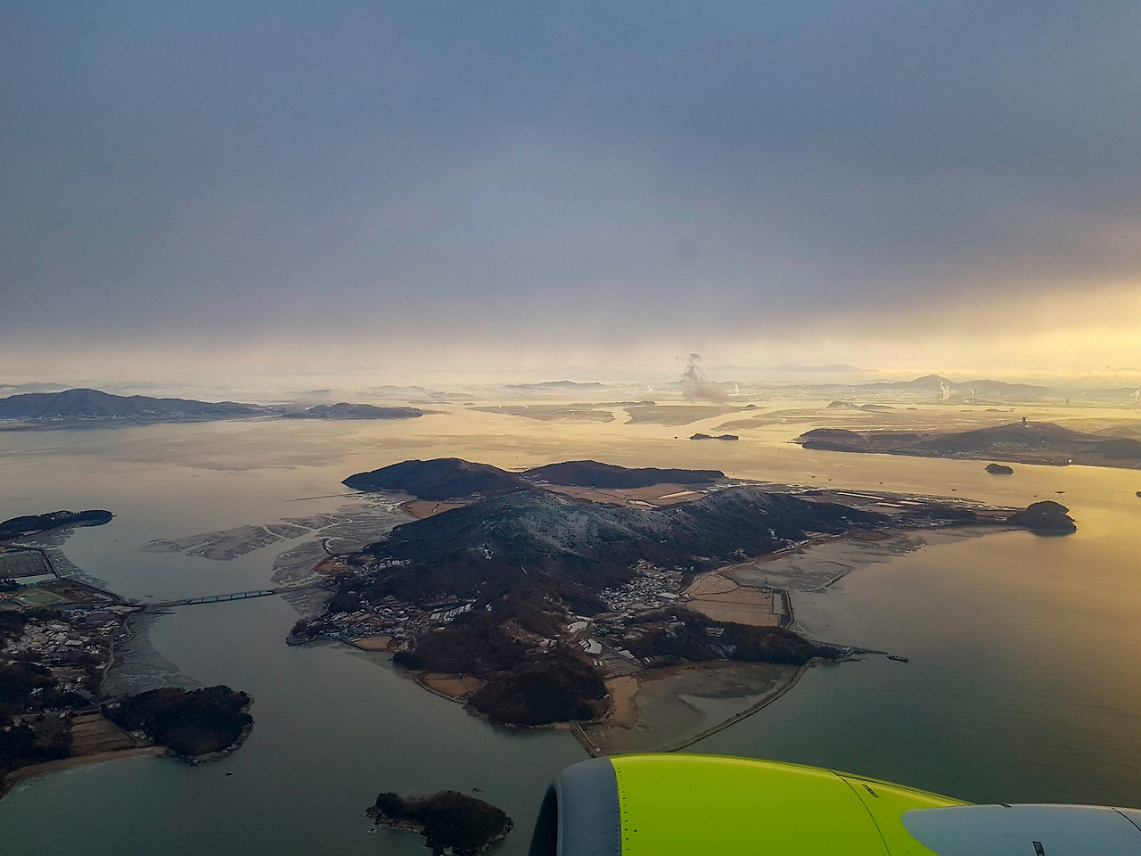 드디어 출발이다. 이륙한 비행기 창 밖으로 시도(좌)와 신도(우)가 보인다. 영종도 선착장에서 배를 타고 갈 수 있는 신도, 시도, 모도는 연도교로 세 섬이 모두 연도교로 연결되어 있어 자전거로도 쉽게 둘러볼 수 있는 곳이다.