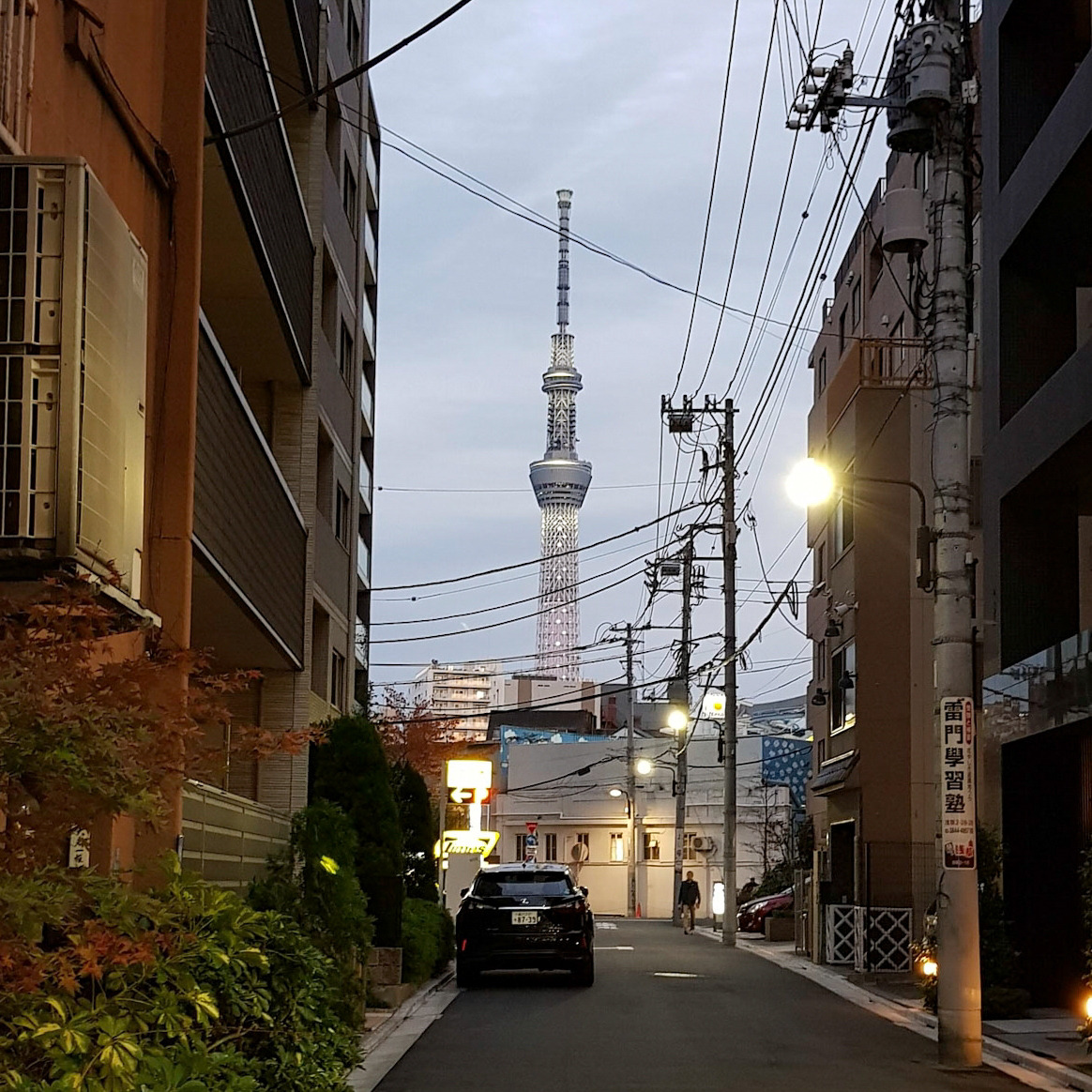 오늘 예약해둔 숙소는 센소지 북서쪽에 있다. 상점가가 즐비하고 관광객들이 미어터지는 센소지 남쪽을 지나 센소지 서쪽 구역으로 가면 분위기가 완전히 바뀌고 술집들이 죽~ 늘어서 있다. 술집 구역을 벗어나서 한적한 상점가 골목에 오늘 예약한 호텔이 있다. 호텔에 들어가는 길에 도쿄의 랜드마크라 할 수 있는 스카이트리가 보인다. 높이 600 m를 넘어가는 전파 송출용 탑이라고 한다.