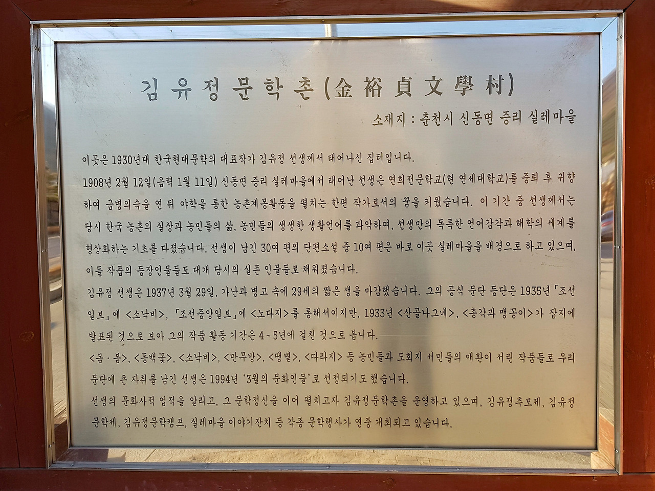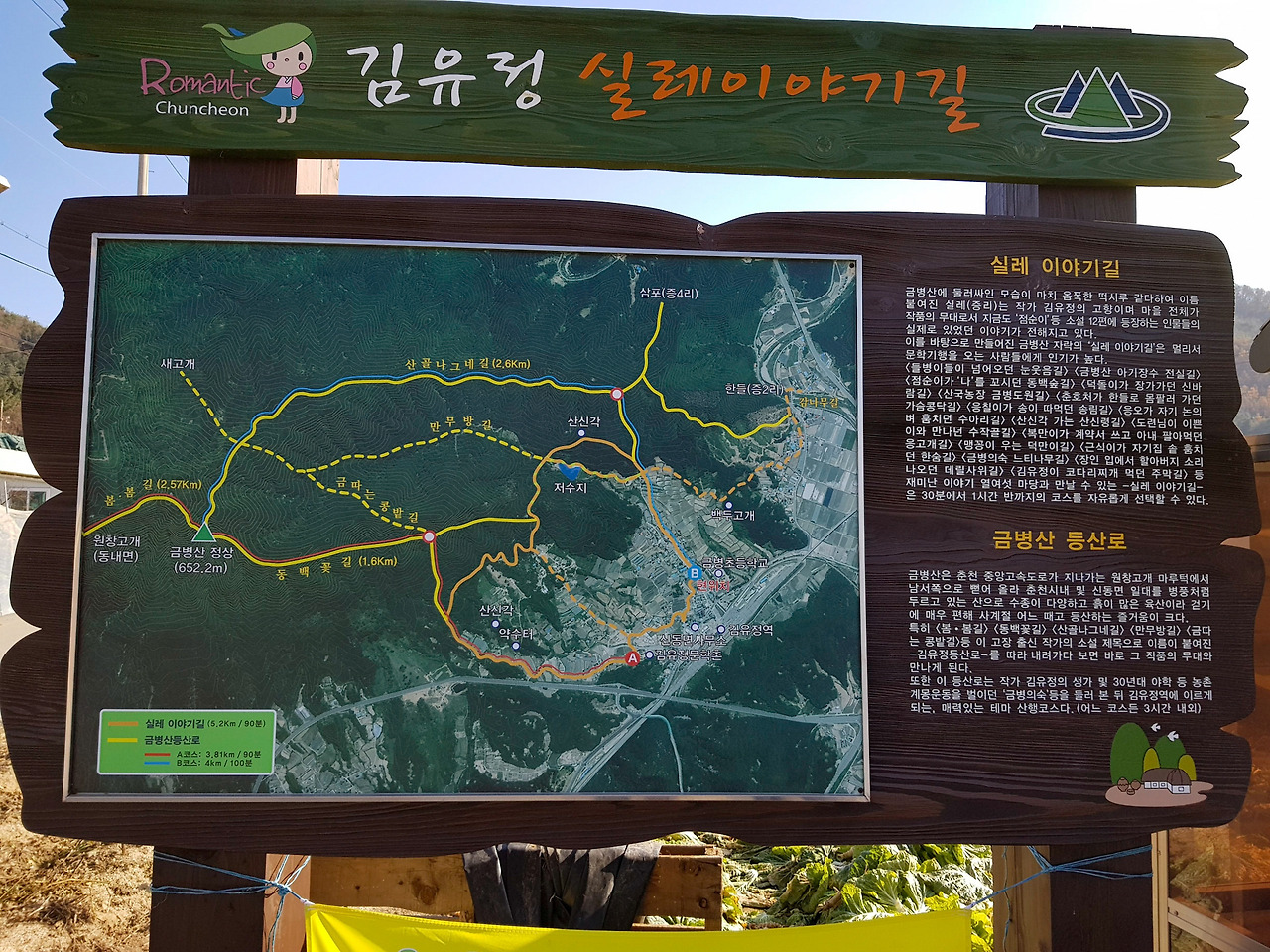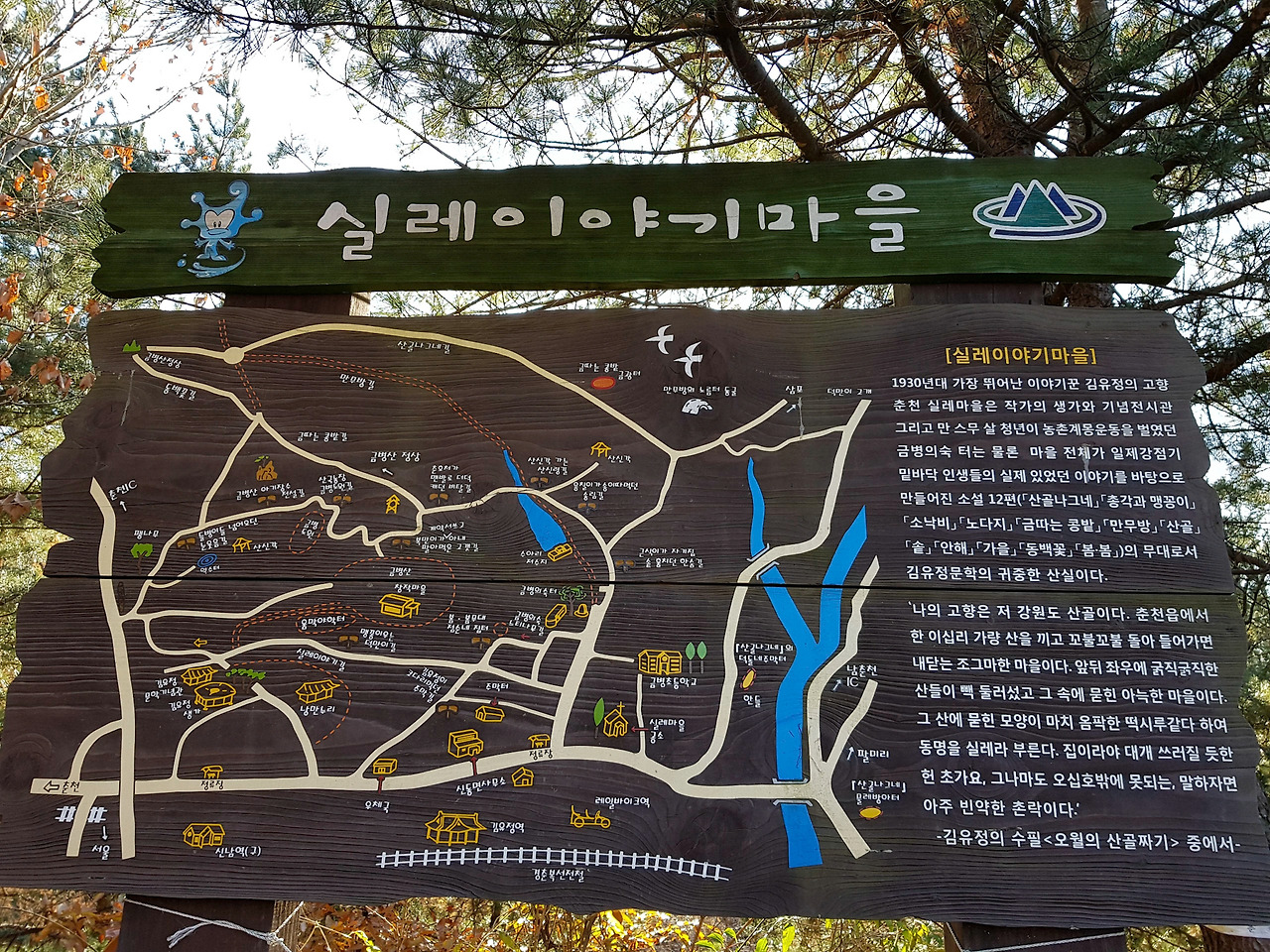 소설가 김유정을 테마로 하는 관광지를 조성하다보니 봄내길 1코스의 이름도 실레이야기길이고 코스 곳곳에 김유정의 소설에 관련된 내용들이 있다.