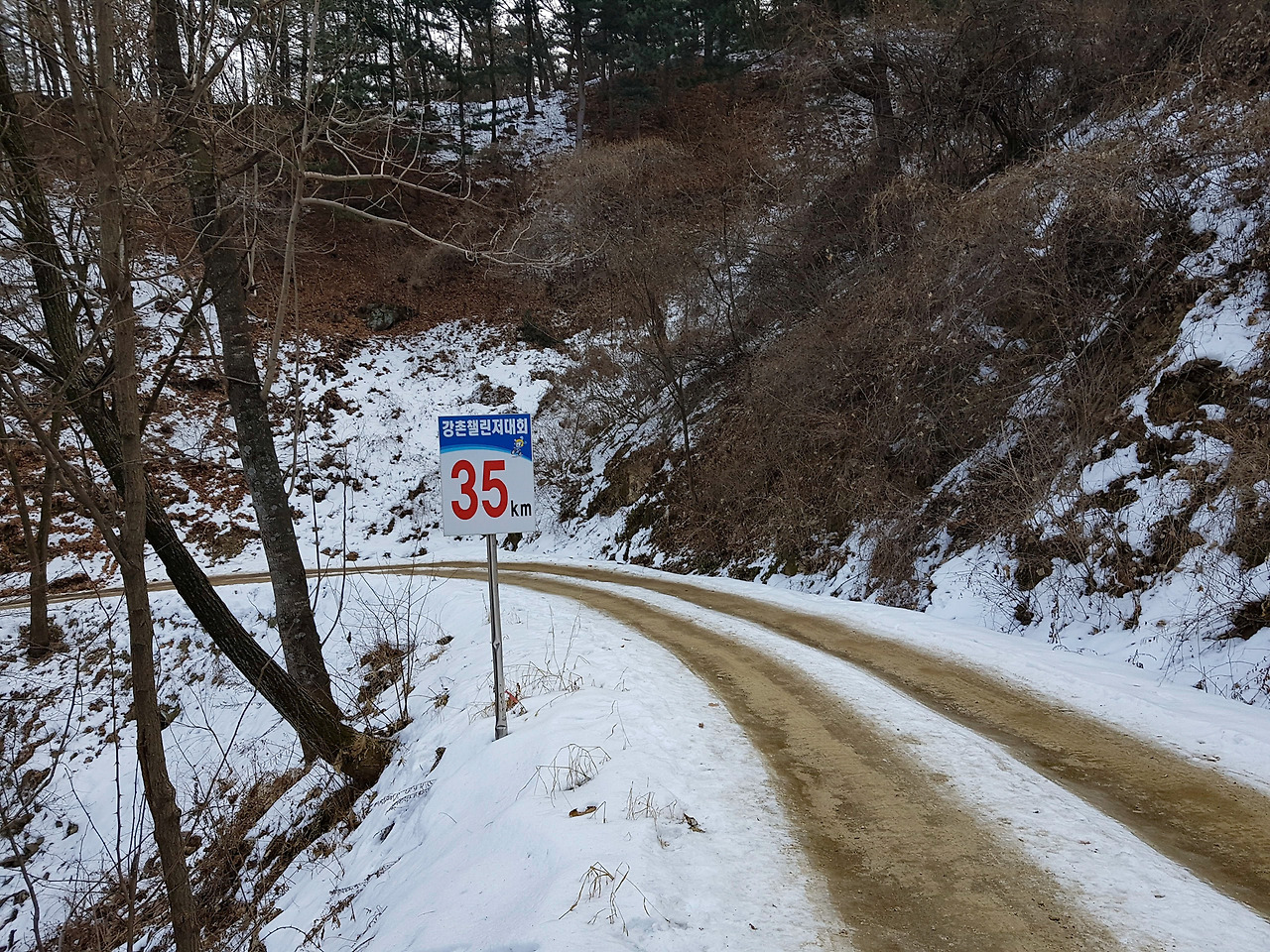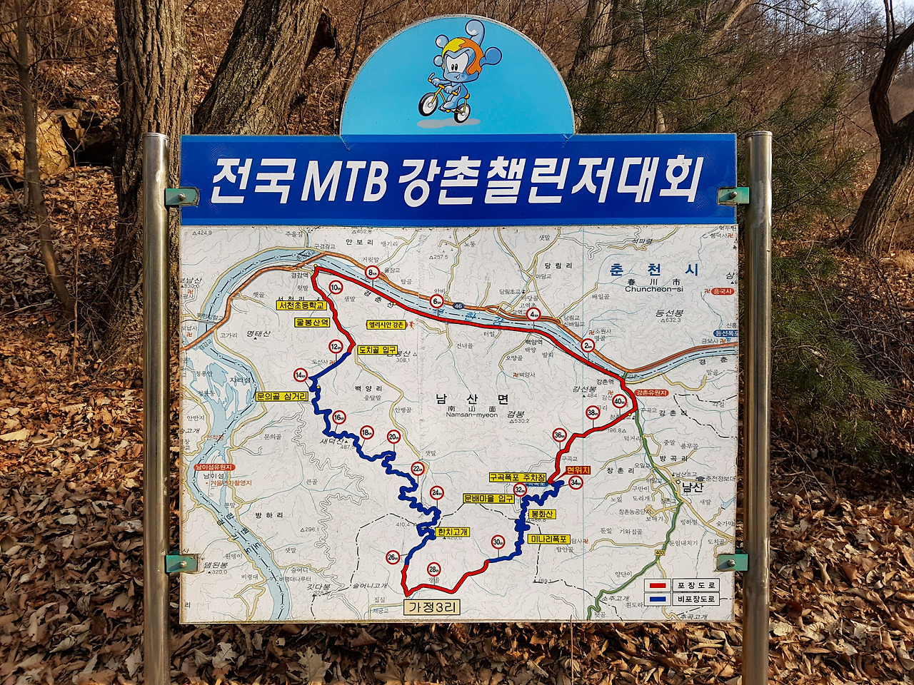 강촌 산악자전거 대회의 표지판이 길 옆에 있다.