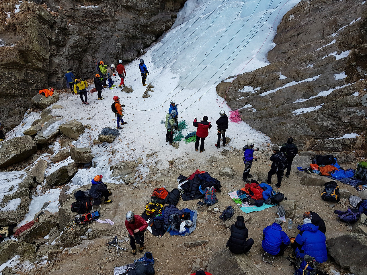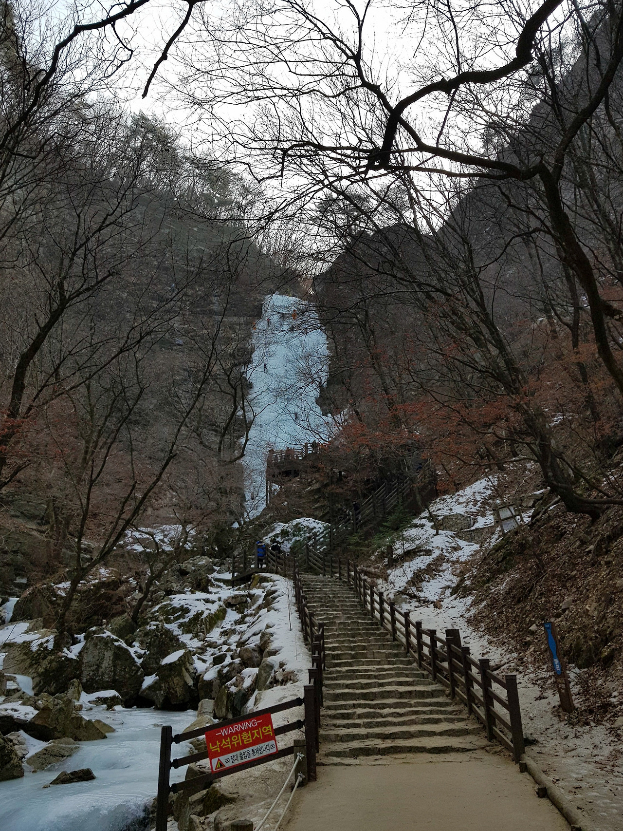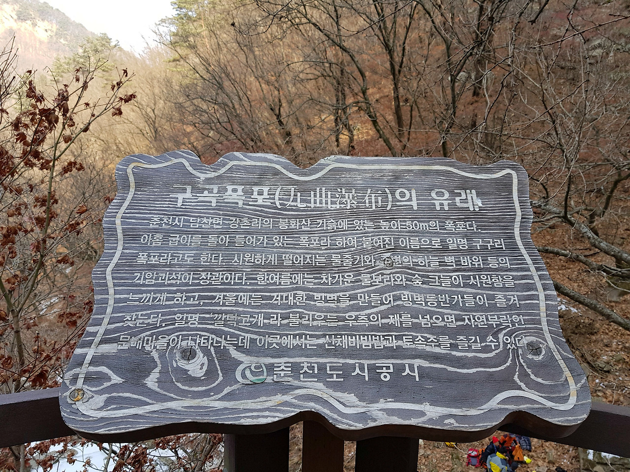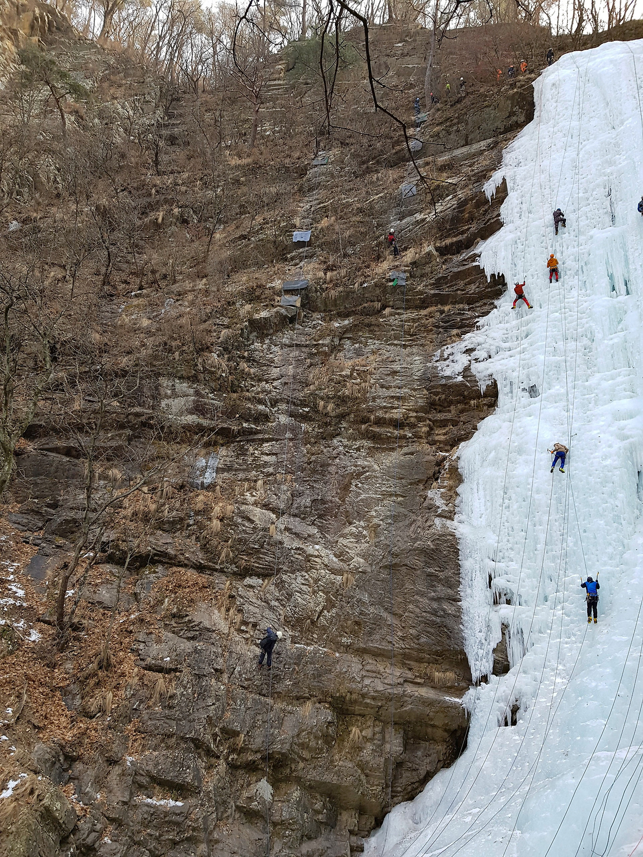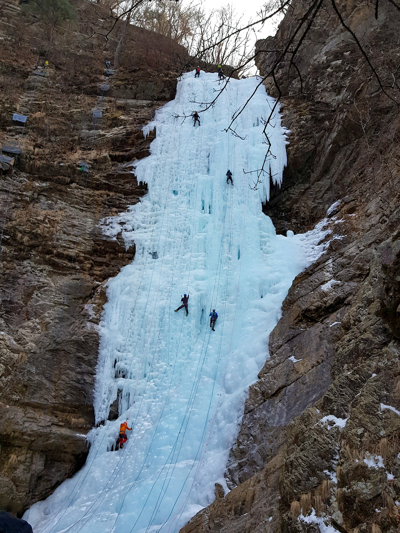 겨울이라 높이 50미터에 달하는 높은 폭포가 완전히 얼어 거대한 빙벽이 되었다. 빙벽등반을 하는 사람들이 많이 찾는 명소라고 알고 있었는데 오늘도 많은 사람들이 구곡폭포를 오르고 있었다.