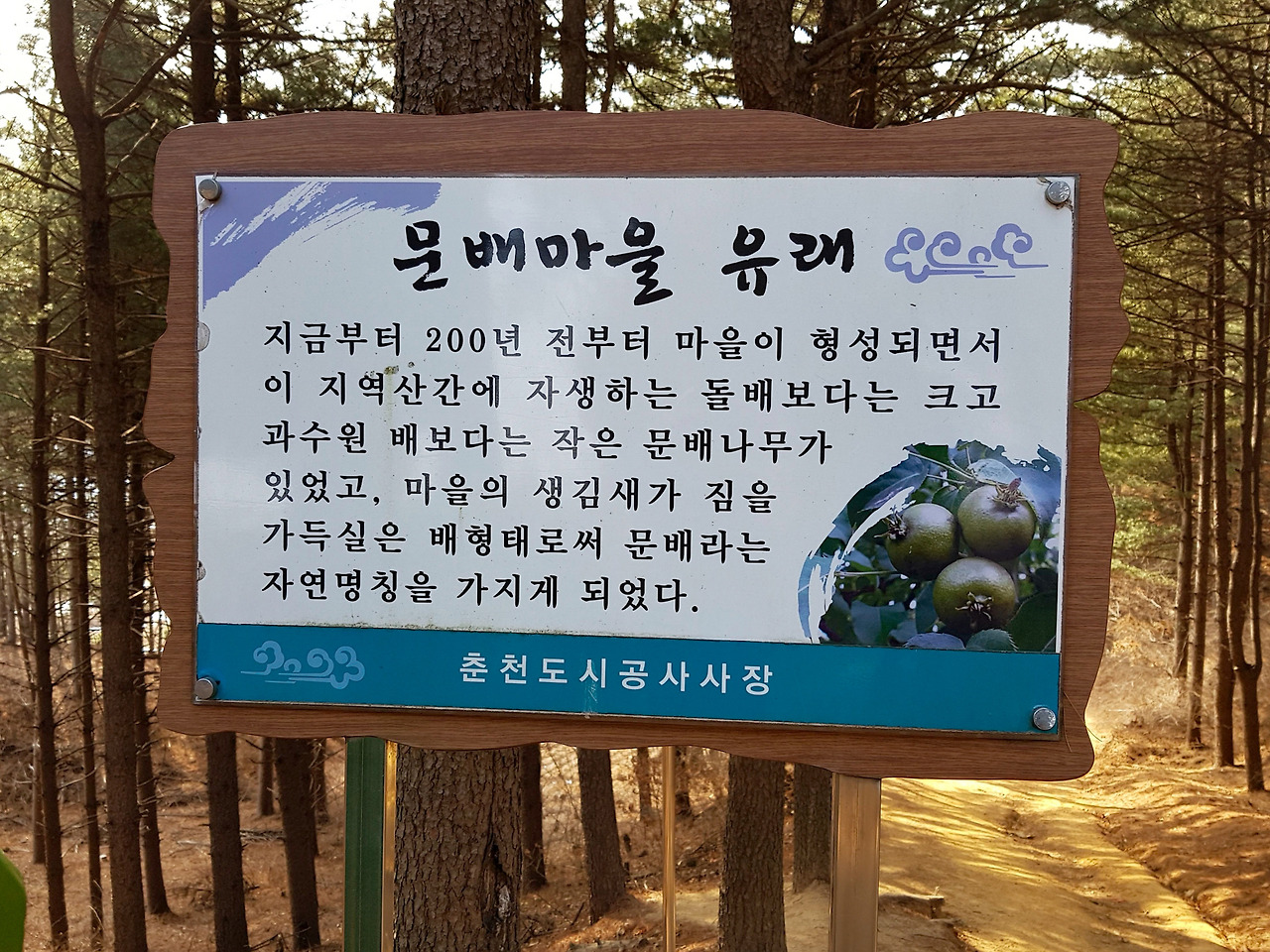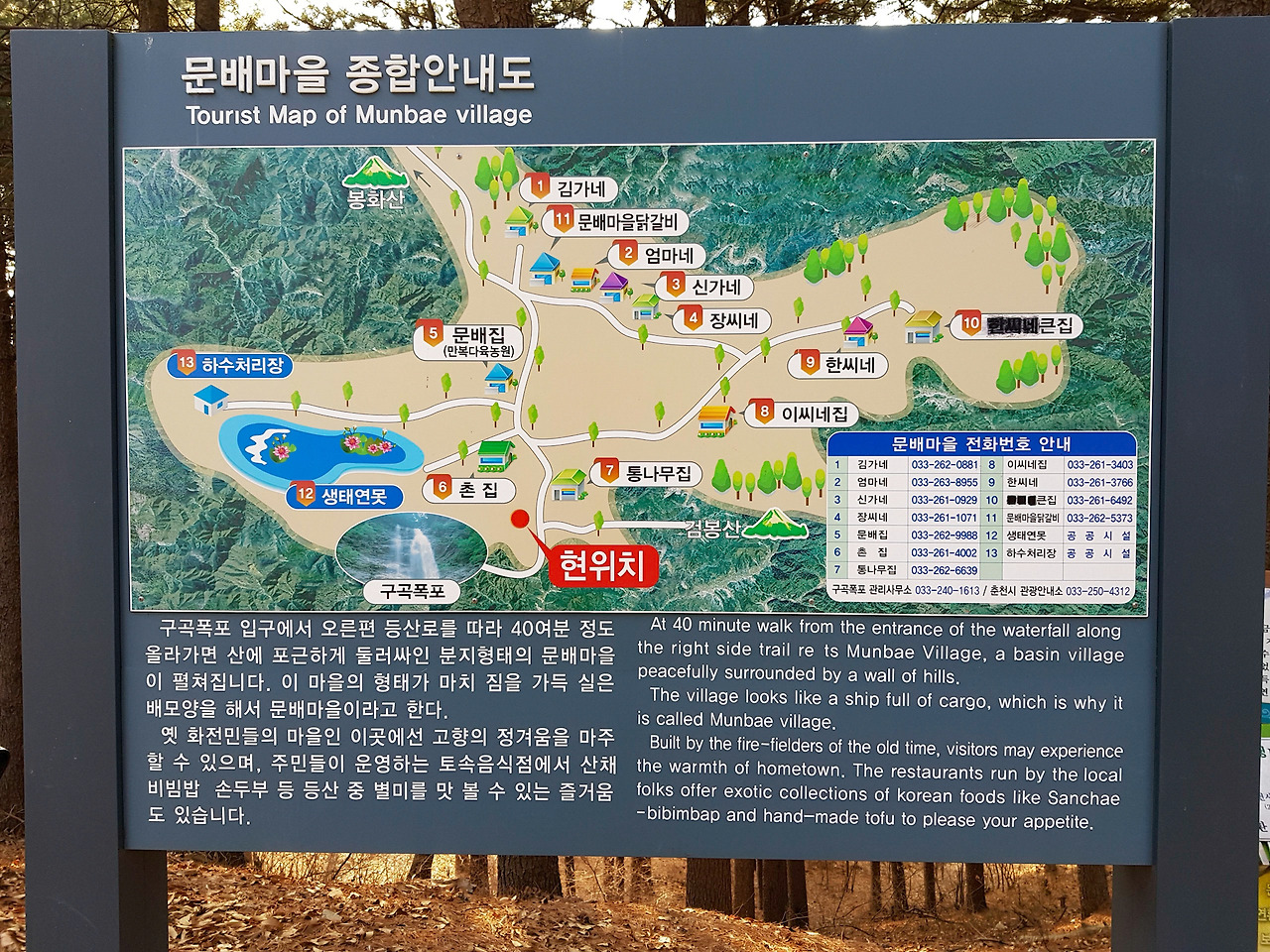 여기에 문배마을 안내도와 마을의 유래가 있다. 원래는 사람 발길 적은 작은 마을이었겠지만 이젠 식당촌일 뿐이다.