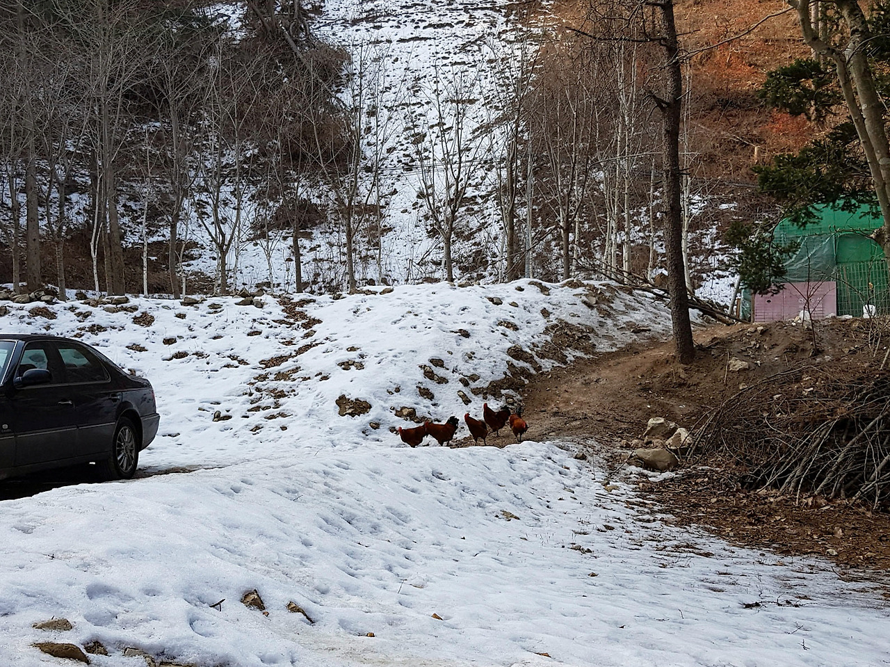 식당에서 키우는 닭들이 나들이를 나왔다. 이놈들 자꾸 울어서 시끄럽다.
