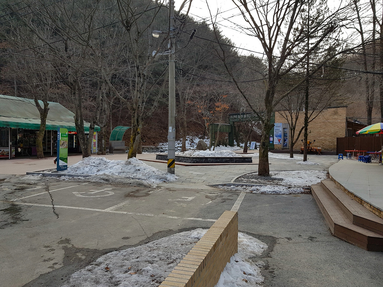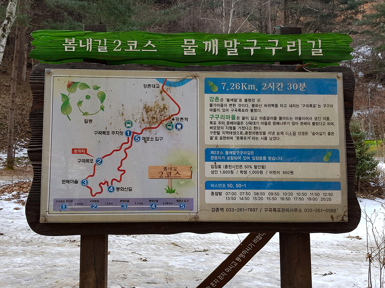겨울이라 아침 일찍 출발하면 추우니 지난 번처럼 점심 먹고 천천히 움직인다. 강촌역 근처 물깨말의 구곡2교차로에서 구곡폭포 이정표를 따라서 들어가면 길 끝에 구곡폭포 주차장이 있다. 주차장 차단기가 열려 있길래 개방해놓았나 했더니 주차료 1000원의 유료주차장이었다.