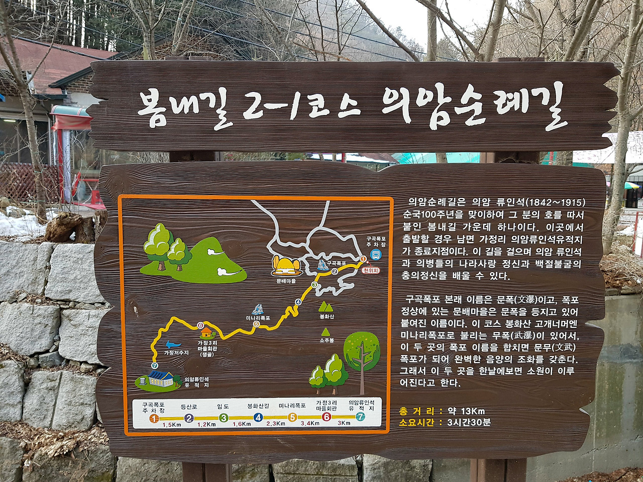 주차장에서 다시 차를 타고 돌아왔다. 우리는 남들보다 천천히 걷는 편이라 3시간 정도 걸렸다. 가벼운 산책으로 나쁘지 않은 거리의 코스다. 다음 봄내길 3코스는 석파령을 넘어가야 하는 길이니 겨울이 지나고 눈 녹는 봄이 오면 다녀오기로 한다.