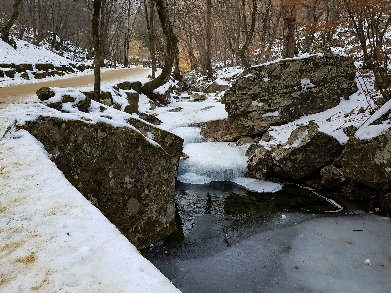 오늘은 따듯한 편이지만 그래도 한겨울인지 바위에 고드름이 흐르듯이 맺혀 있다.