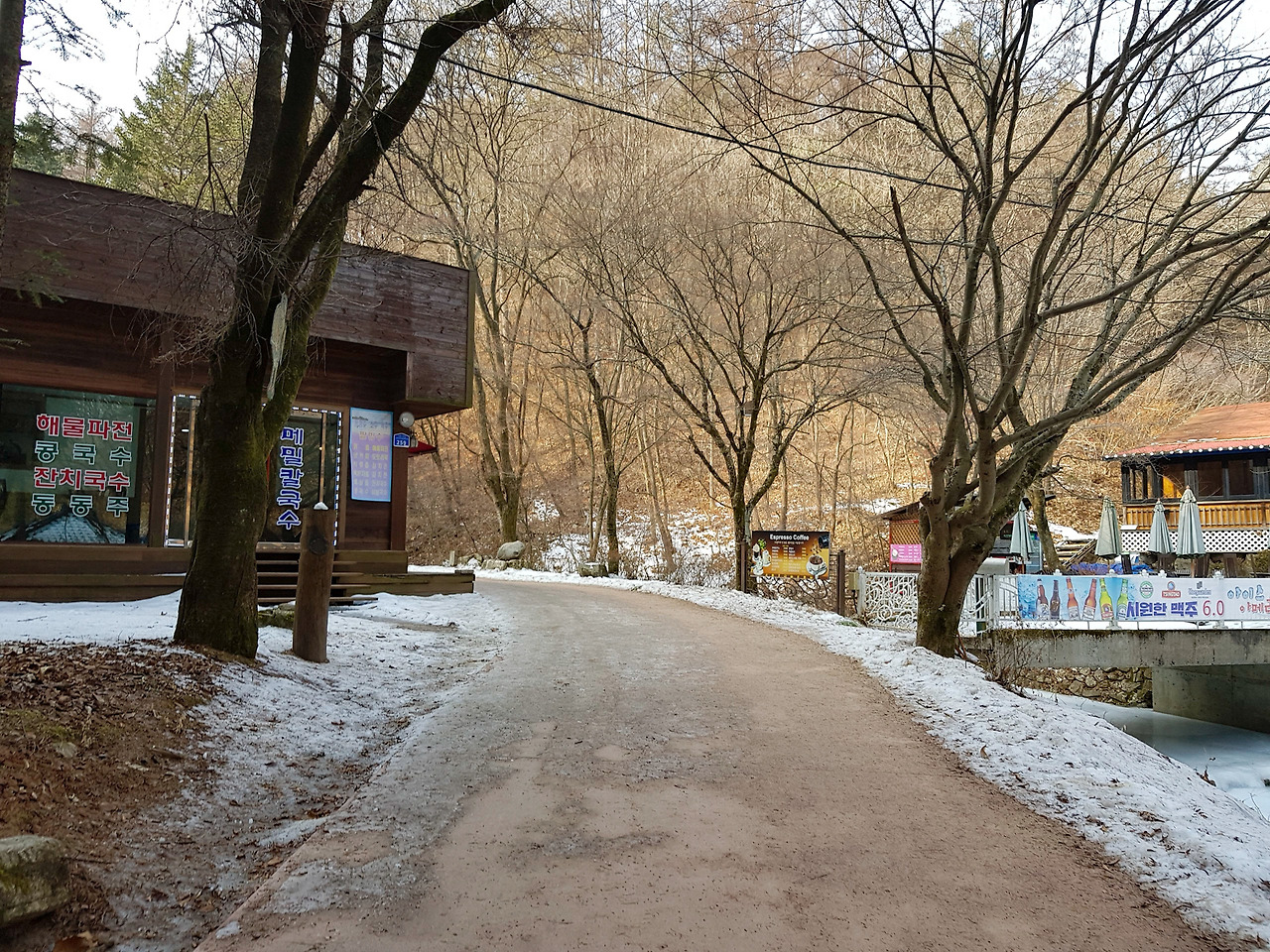겨울이라 그런지 주차 공간은 넉넉하다. 구곡폭포 쪽으로 가는 길 입구의 매표소에서 매표를 해야 한다. 국립공원도 도립 공원도 아닌데 입장료가 1600원이나 한다. 하긴 제주도의 폭포들도 입장료가 2000원이니 그러려니 싶다.