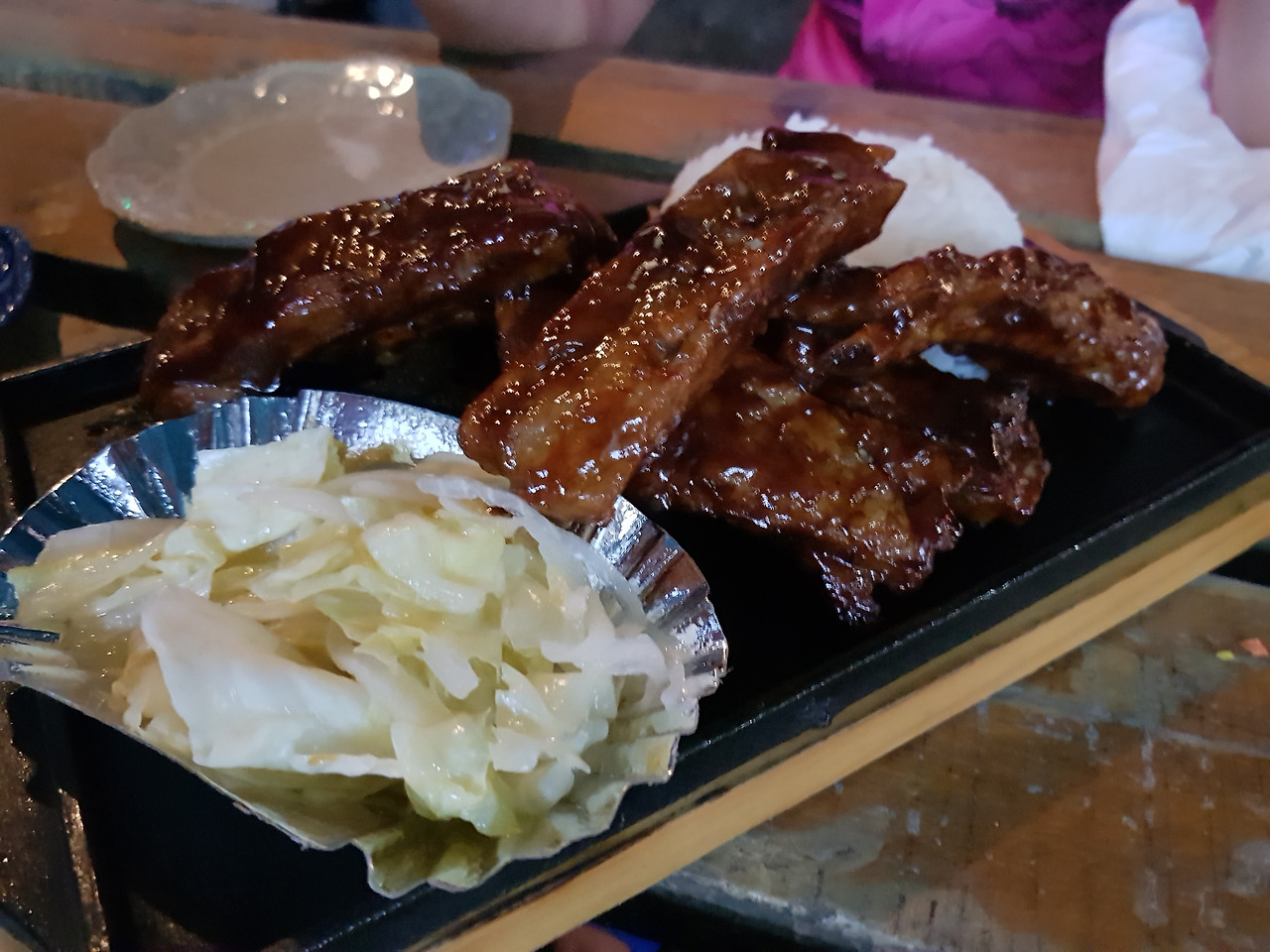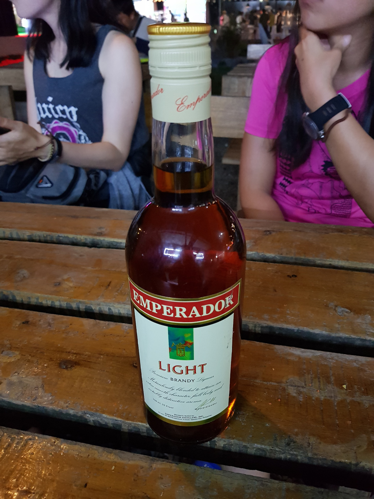 여기는 푸드코트 스타일로 가운데에 테이블들이 있고 여러 상점이 쭉 늘어서 있다. 여기저기 둘러봤지만 결국엔 가장 처음 들렀던 바베큐집에서 각자 먹을 식사 하나씩, 그리고 바베큐 폭립 라지를 주문했다. 술은 필리핀의 브랜디라는 엠페라도로 마신다. 불을 쓰는 주방이 많은 곳이다 보니 좀 더우니 엠페라도는 언더락으로~