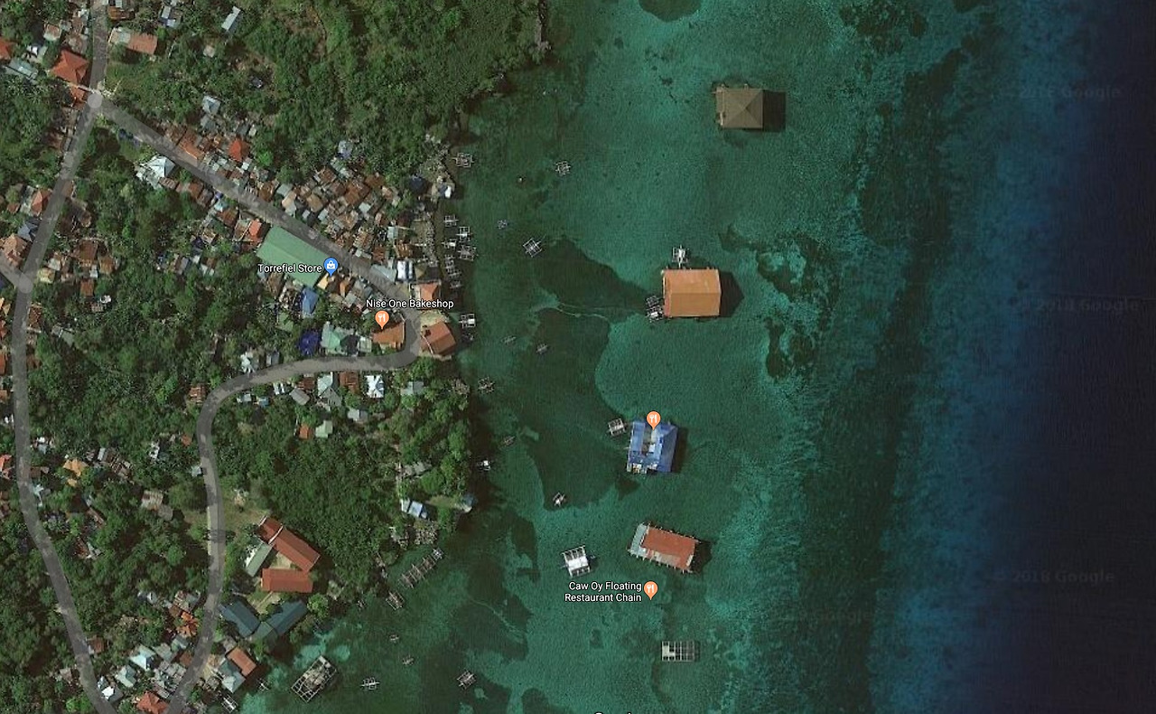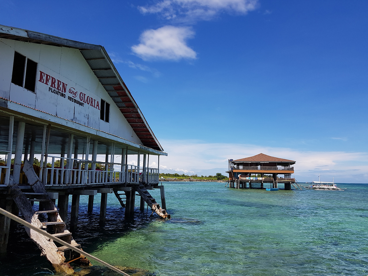 막탄섬에서는 보이지 않는 올랑고섬 뒤편에 해상레스토랑들이 여럿 모여있다.