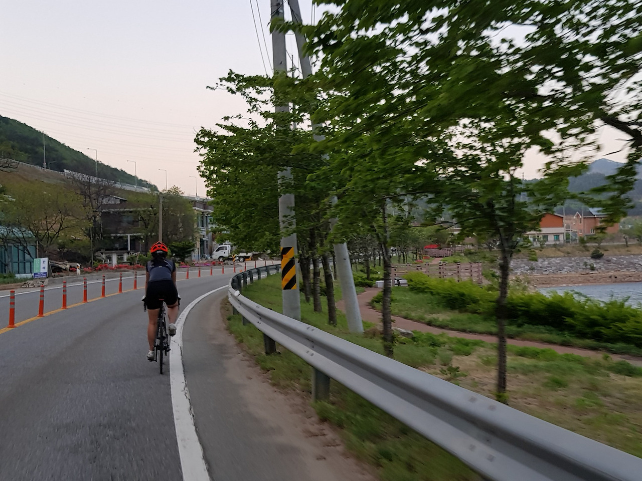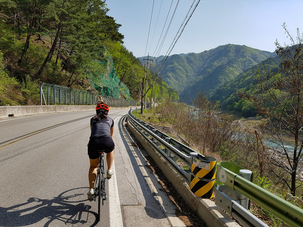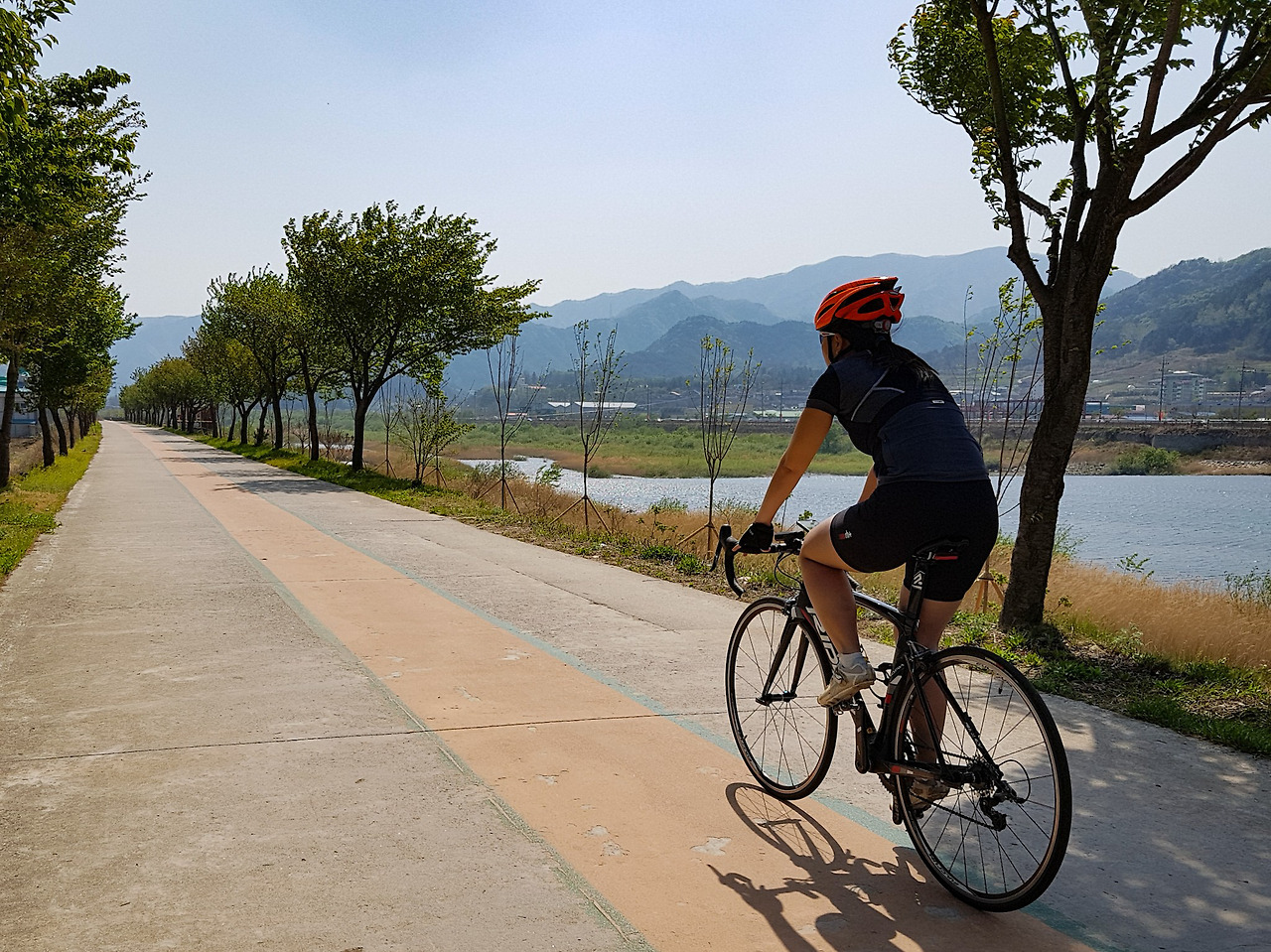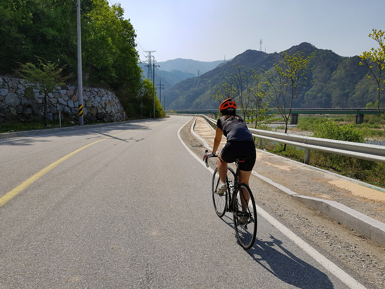 로드바이크로 달리기 무난한 자전거길로 소양강 상류인 북천을 따라 달린다. 길 건너 44번 국도에는 차들이 쌩쌩 달리지만 여기 자전거길은 여유롭다.