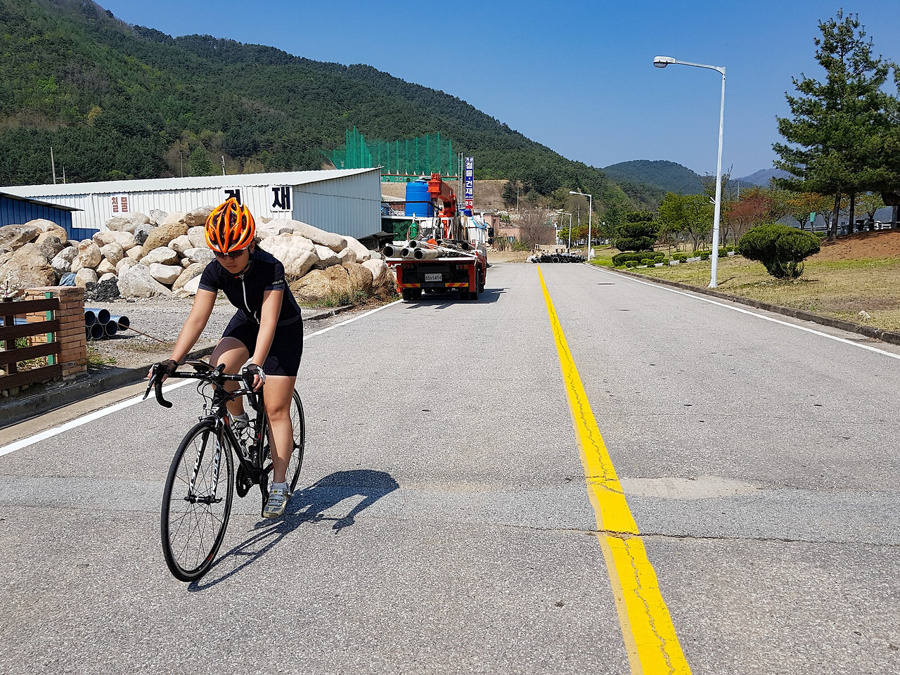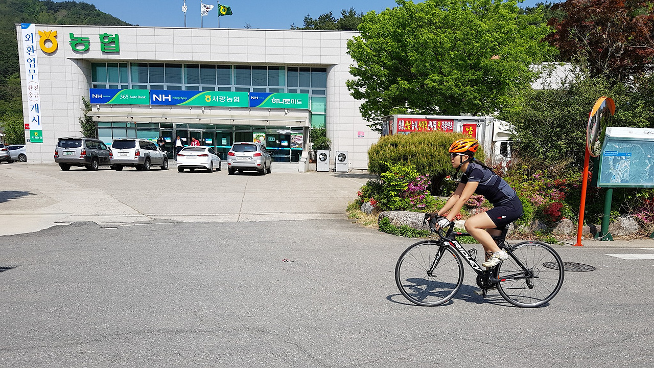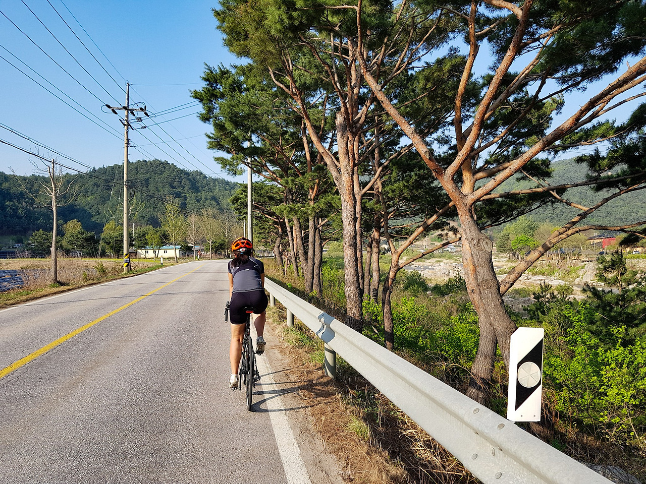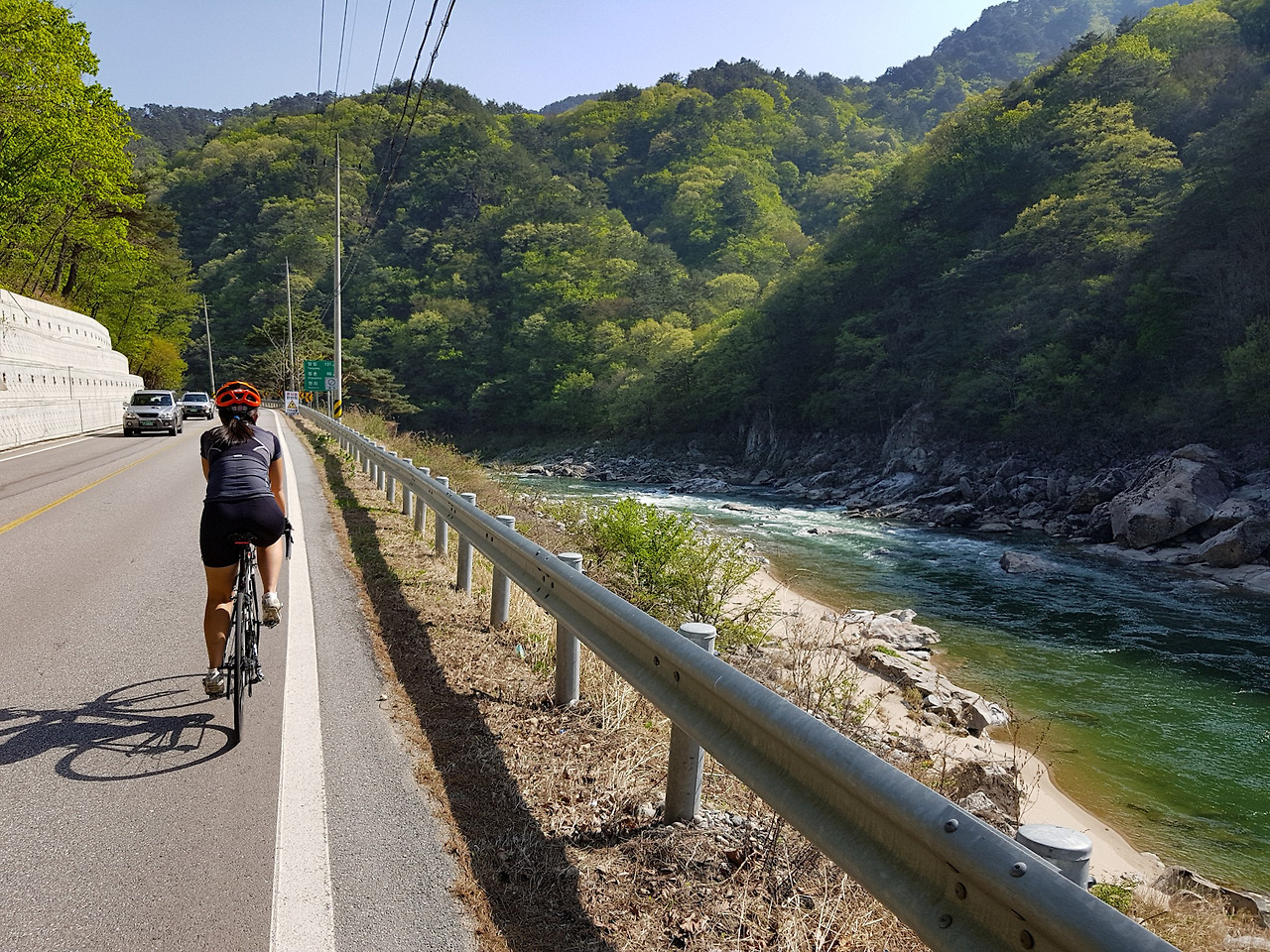 로드바이크로 달리기 무난한 자전거길로 소양강 상류인 북천을 따라 달린다. 길 건너 44번 국도에는 차들이 쌩쌩 달리지만 여기 자전거길은 여유롭다.