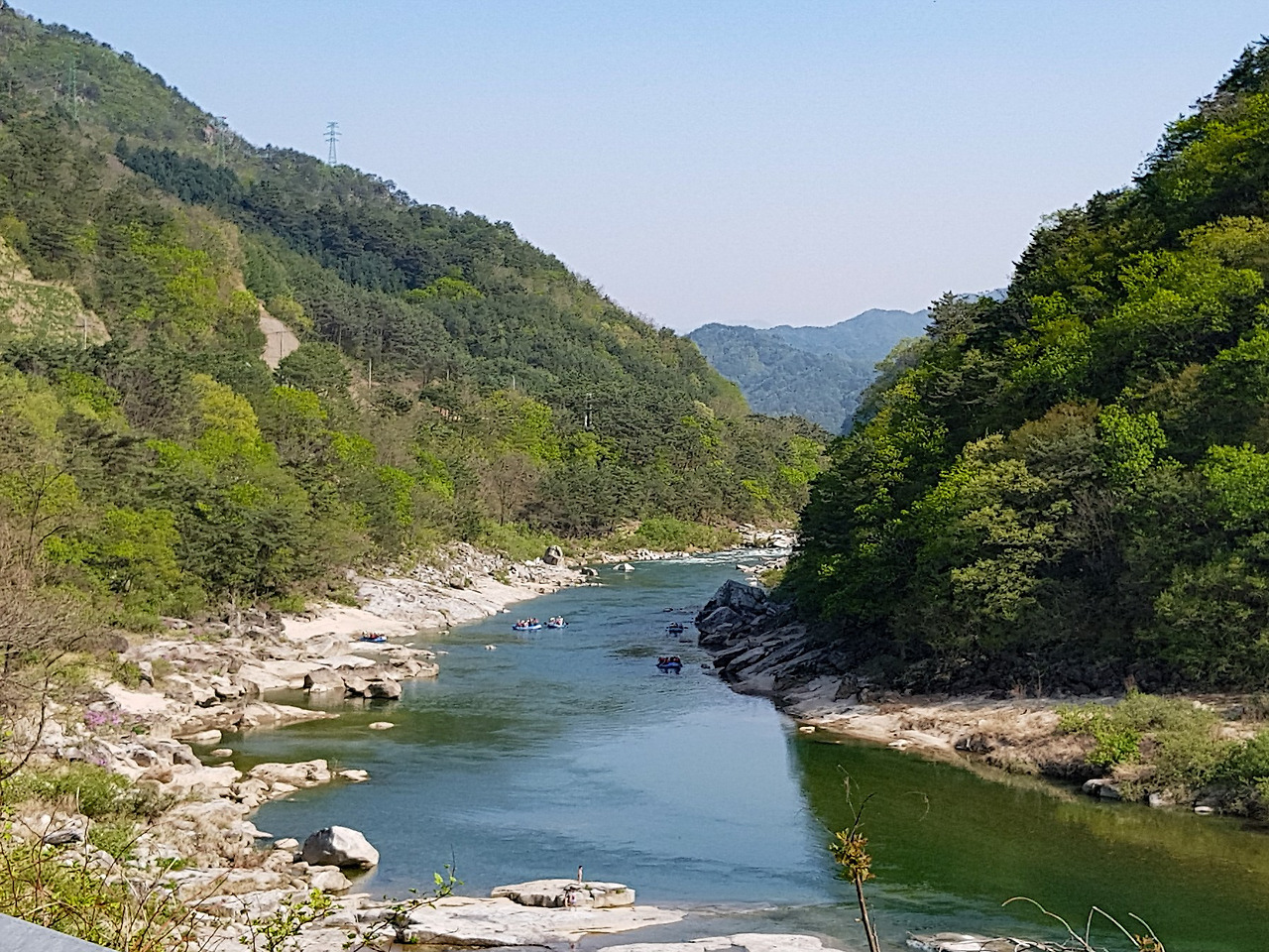 내린천도 래프팅을 많이 하는 곳이다.래프팅 보트가 5대 정도 내려오는게 보인다.