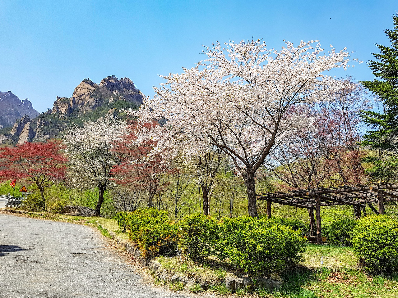푸른 신록 사이에 하얀 벚꽃과 빨간 단풍이 있으니 참 아름답다.