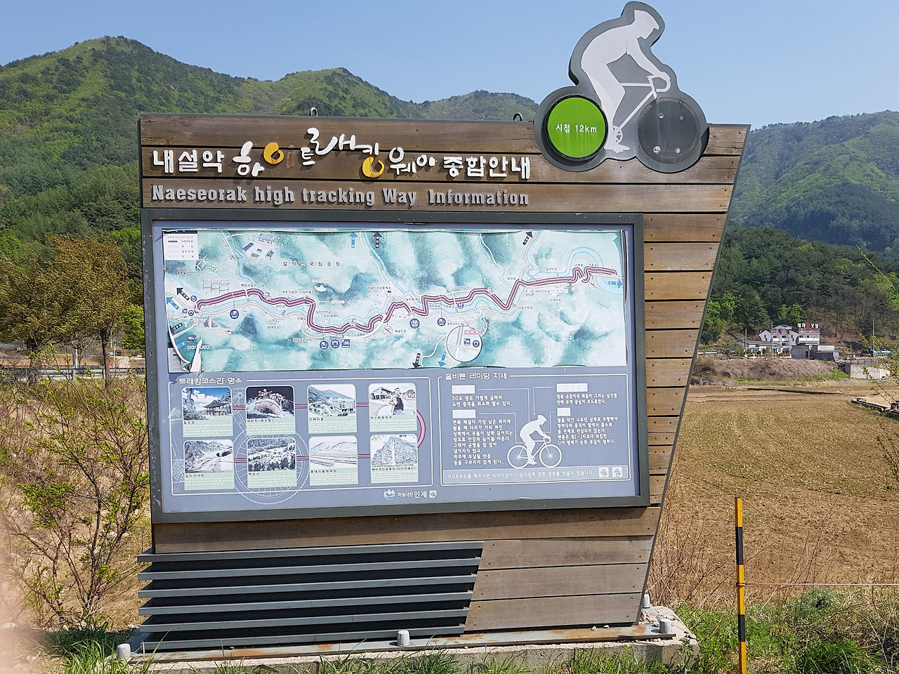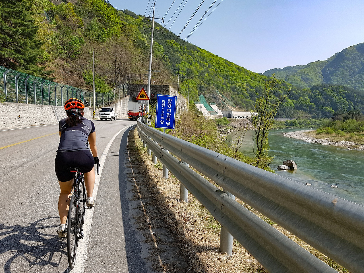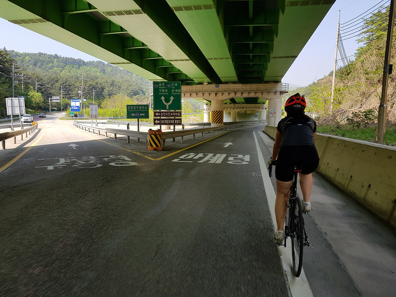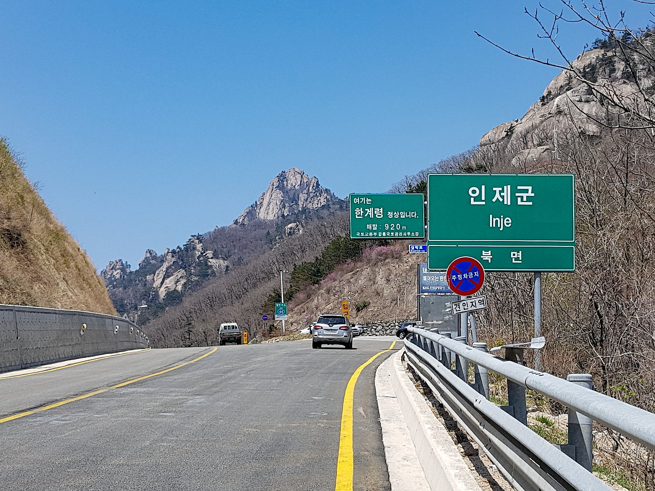 한계교차로까지 내려오면 44번 국도와 만나게 된다. 여기서 내설악 하이트래킹웨이라는 자전거길이 인제 읍내까지 이어지니 차들과 함께 달리기 싫으면 자전거길을 탈 수도 있다. 우리는 원통에서 점심을 먹어야 하니 44번 국도를 잠깐 타고 원통으로 간다.