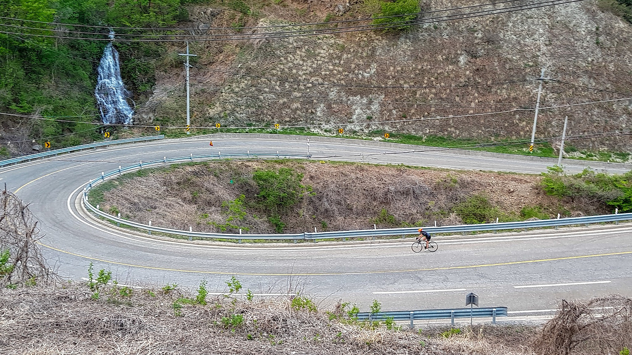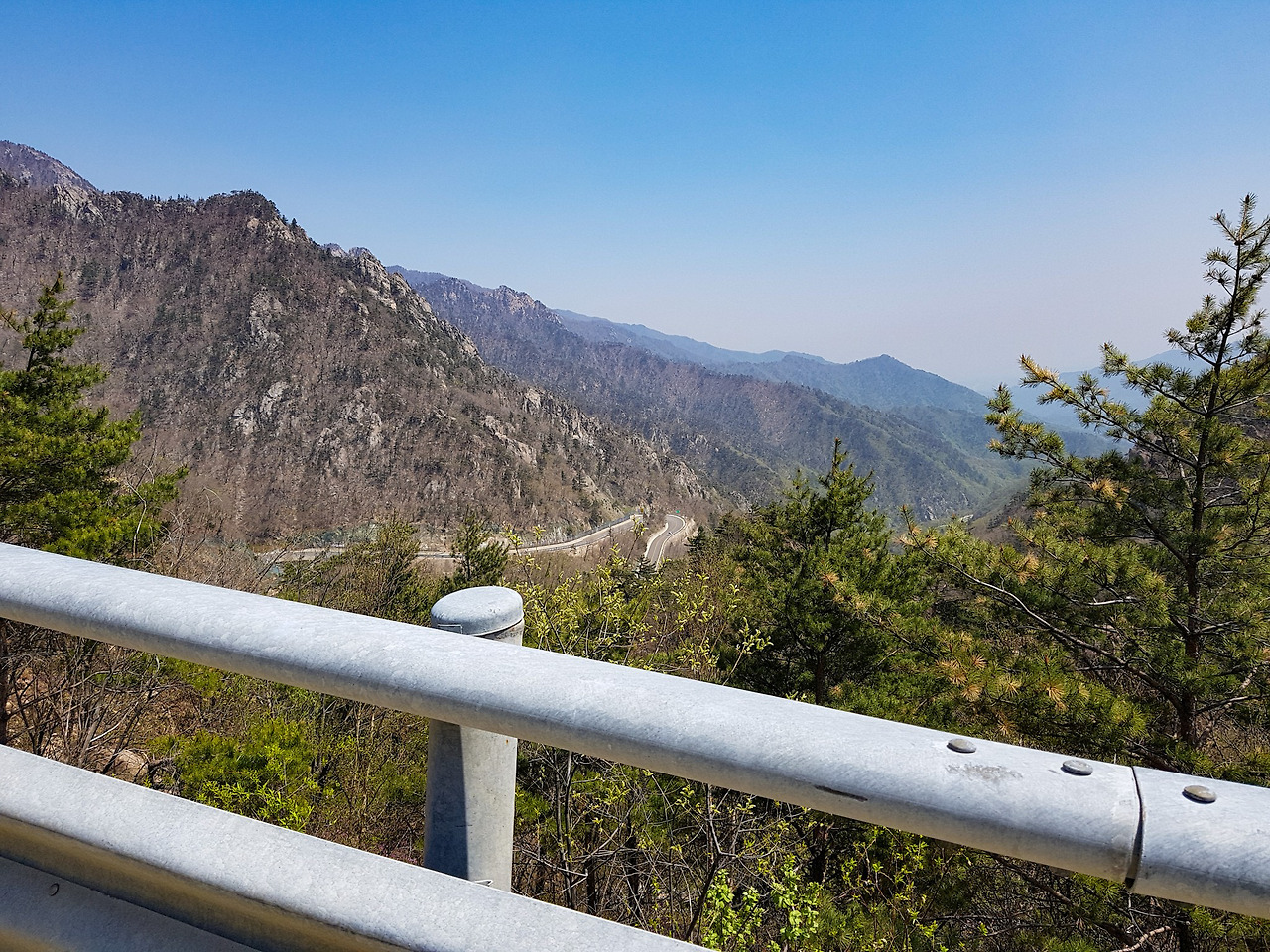 한계령은 미시령 옛길보단 그나마 낫지만 자동차 운전자들에게는 그리 만만하지 않는 급한 헤어핀 커브길이 많다. 건너편에 보이는 도로까지 크게 한 번 돌고 저 도로 끝에서 급하게 한 번 꺾인다.