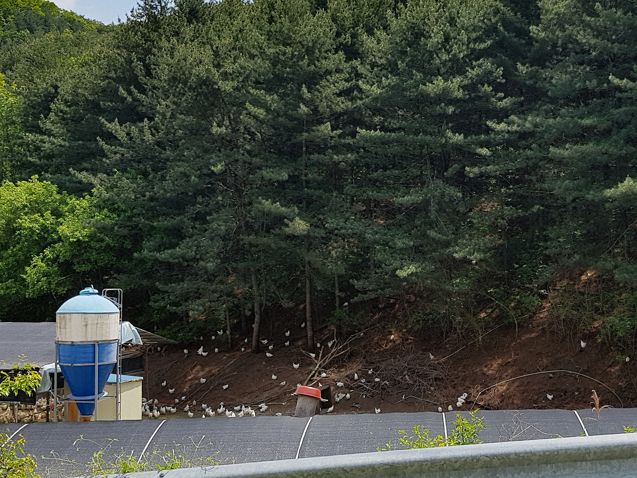군자리에선 소 축사가 많았는데 여기는 오골계 축사가 있다. 관리가 잘 되는 편인지 닭 냄새가 다른 양계장만큼 심하진 않다.