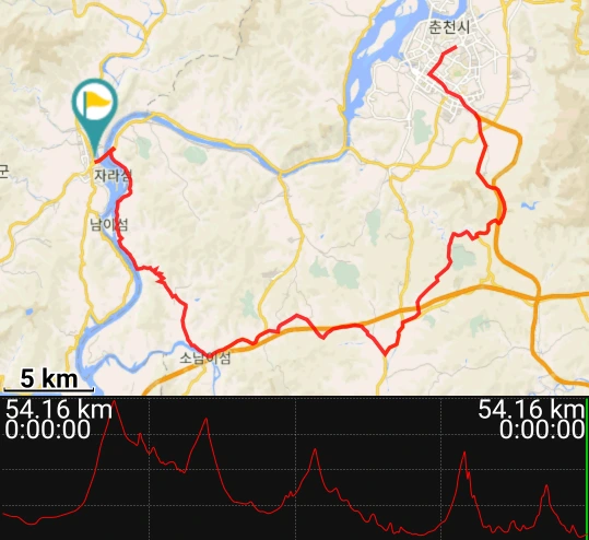지니님이 사는 춘천에서 출발해서 춘천 남쪽의 사잇길을 55 km 정도 탔다. 이처럼 자기가 사는 곳 근처의 안 가본 길을 한 바퀴 돌아보는 것도 나름대로 재미있는 라이딩이 된다.