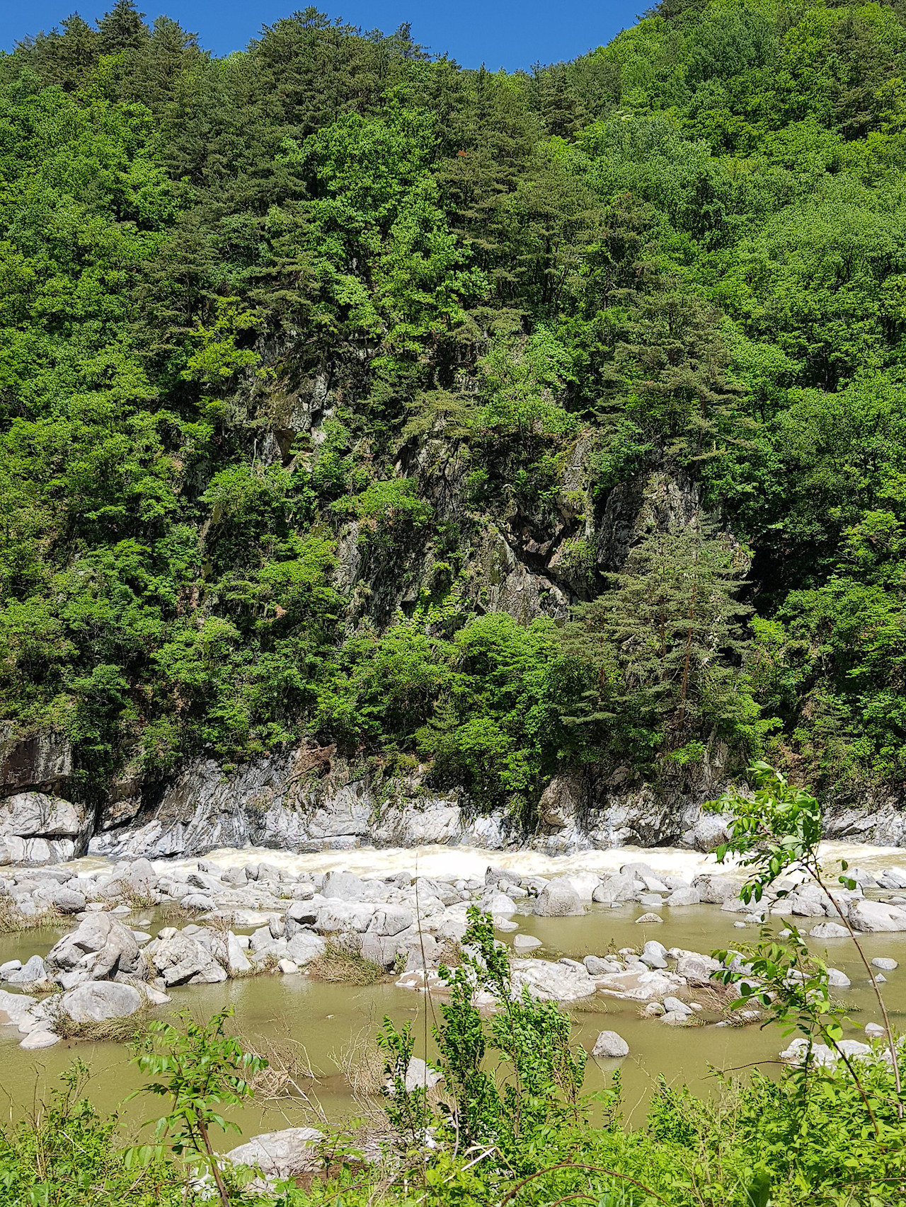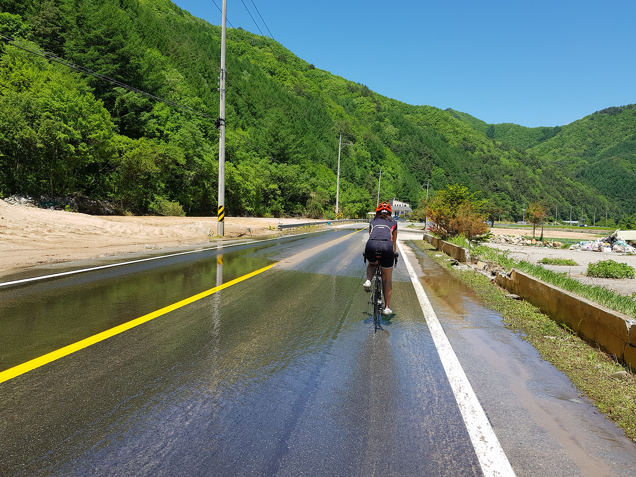 며칠 동안 비가 내린 탓에 계곡 물이 도로로 흘러넘친 곳이 많다. 최대한 살살 지나가는데도 물이 잔뜩 튄다.