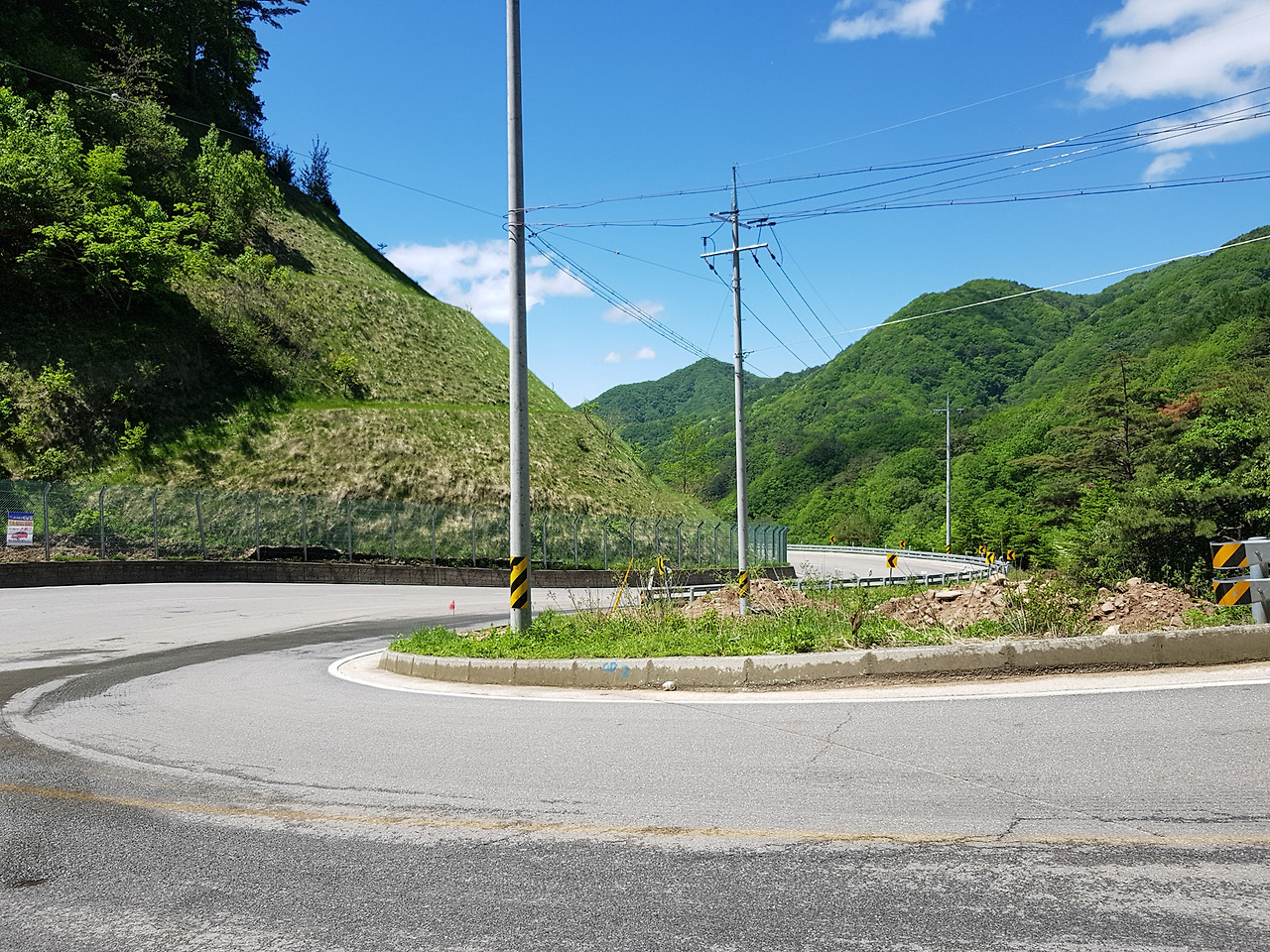 S자 헤어핀 급커브 구간을 두 번 지나서 열심히 꼬부랑길을 올라가니 하뱃재 정상이 나온다.