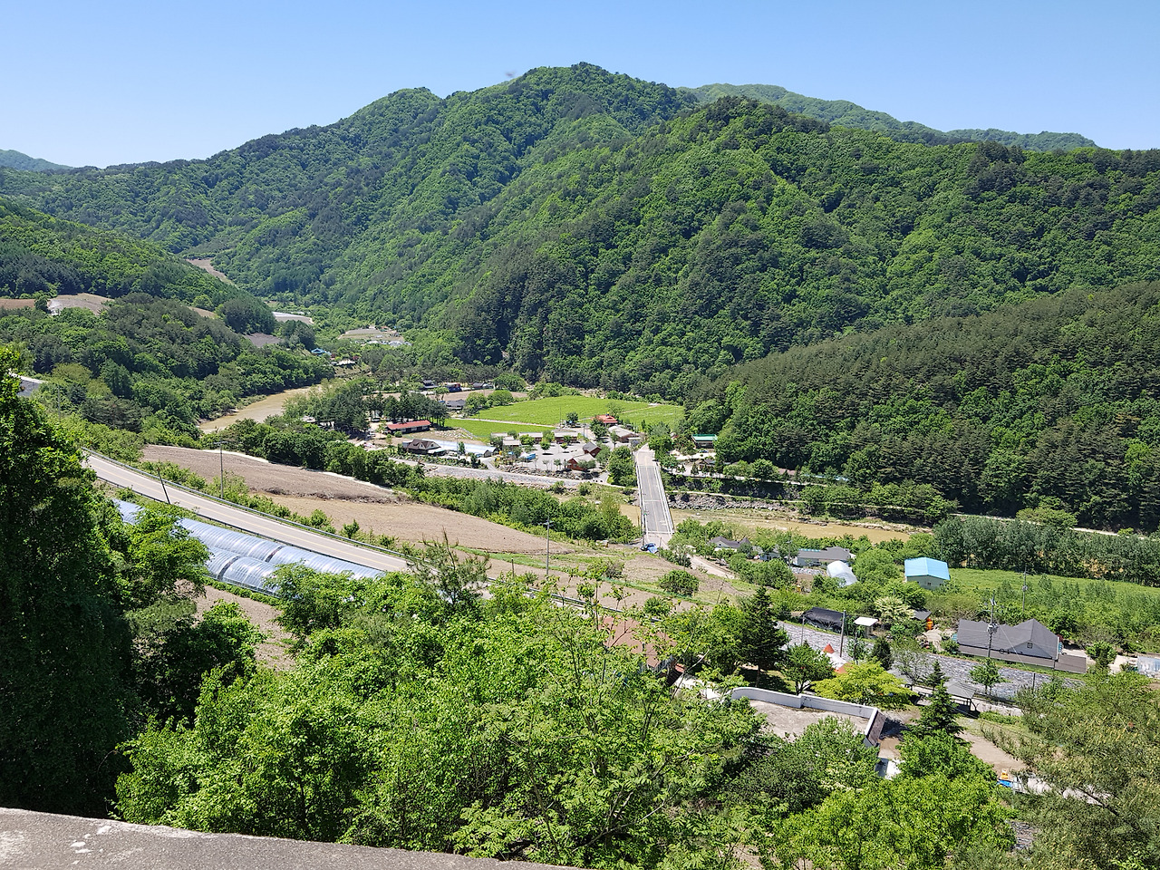 파릇파릇 울창한 숲에 들러싸인 곳이다. 살둔마을은 우리나라 오지 마을 중에 하나라고 한다. 근처에 유명한 관광지가 있는 것도 아니고 도시로 통하는 큰 도로가 있는 것도 아니라서 이 작은 마을에 볼 일이 없다면 이 길을 지나갈 일이 거의 없기 때문에 그런 듯하다.