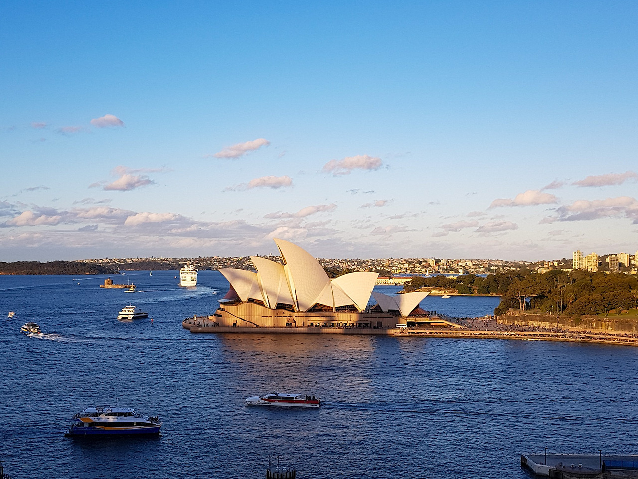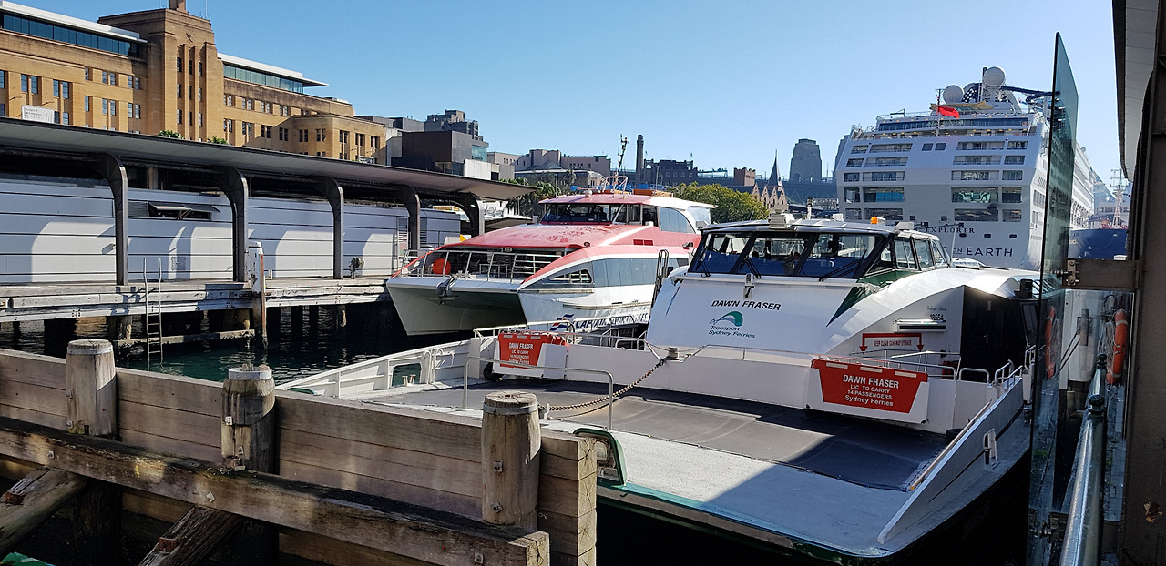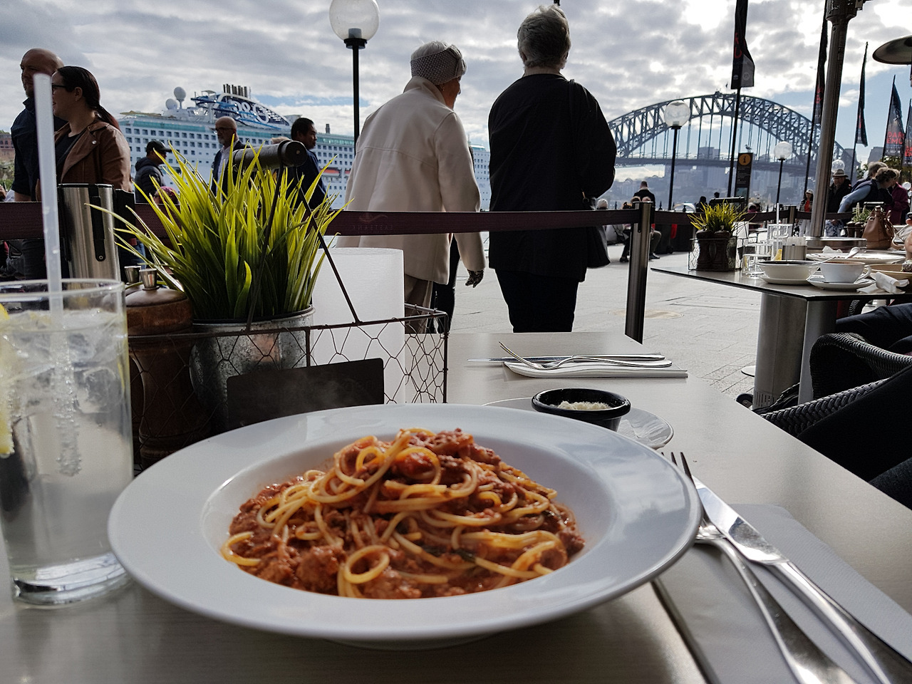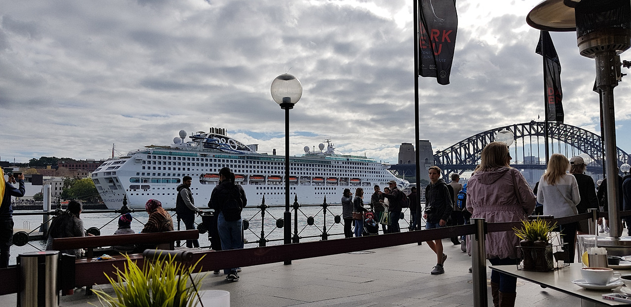 왼쪽으로는 서큘라 퀘이 뒤로 시드니 시내가 보이고 오른쪽으로는 마침 들어와있는 대형 크루즈와 하버브릿지를 보면서 간단히 배를 채운다.
