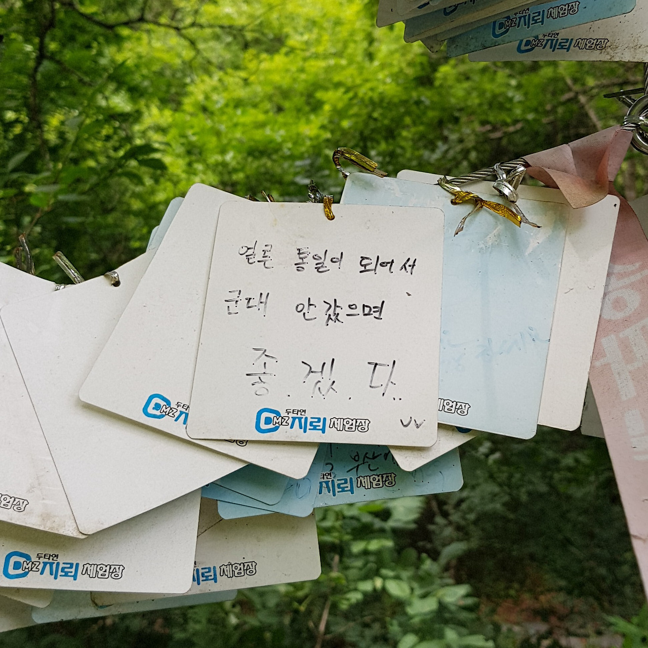 얼른 통일이 되어서 군대 안 갔으면 좋겠다. 라고 쓰여진 것도 있다. 통일 되면 군대 안 갈 것 같니? 개마고원으로 가야지?