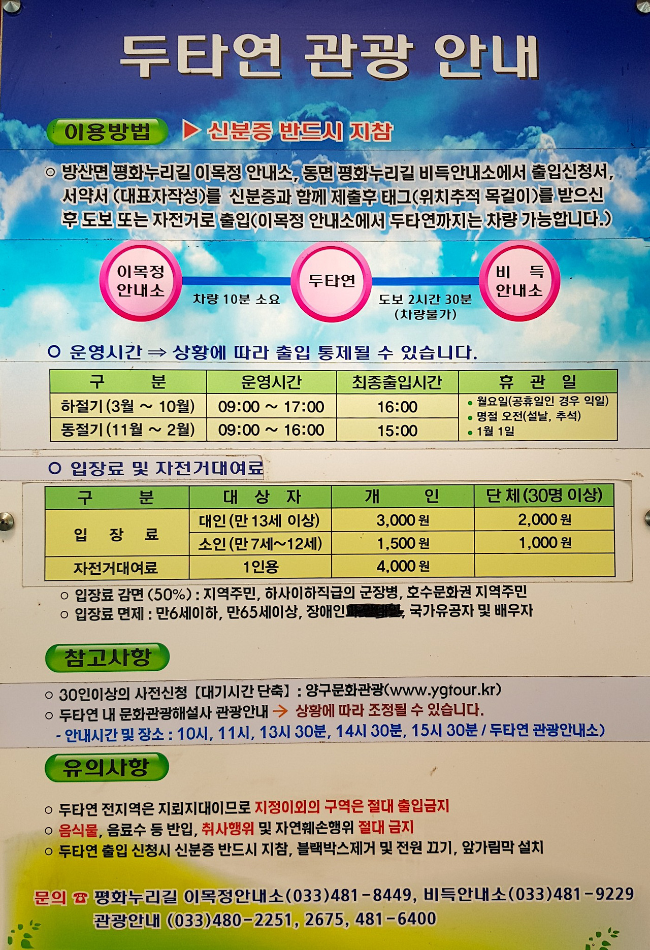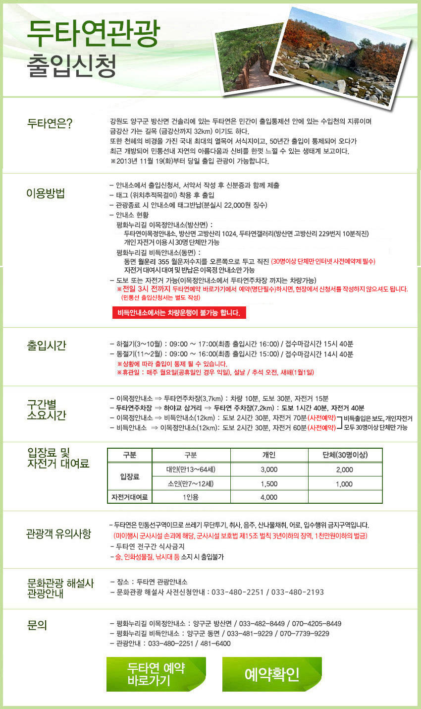 양구관광 홈페이지(www.ygtour.kr)에서 두타연 출입 신청을 예약할 수 있다.