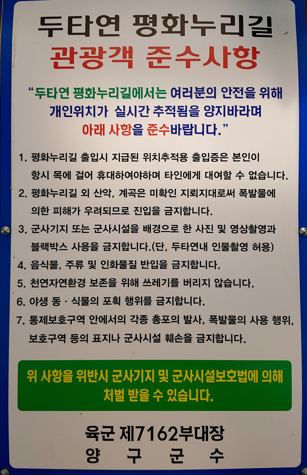 단순히 달리기만 하는 것은 아니다. 양구의 민간인 통제 구역 안쪽에 있는 두타연 출입 신청도 하고 화천의 DMZ 평화누리길도 통과할 수 있도록 가이드 신청도 해놓았다.두 군데 모두 반드시 신분증을 준비해야 한다.