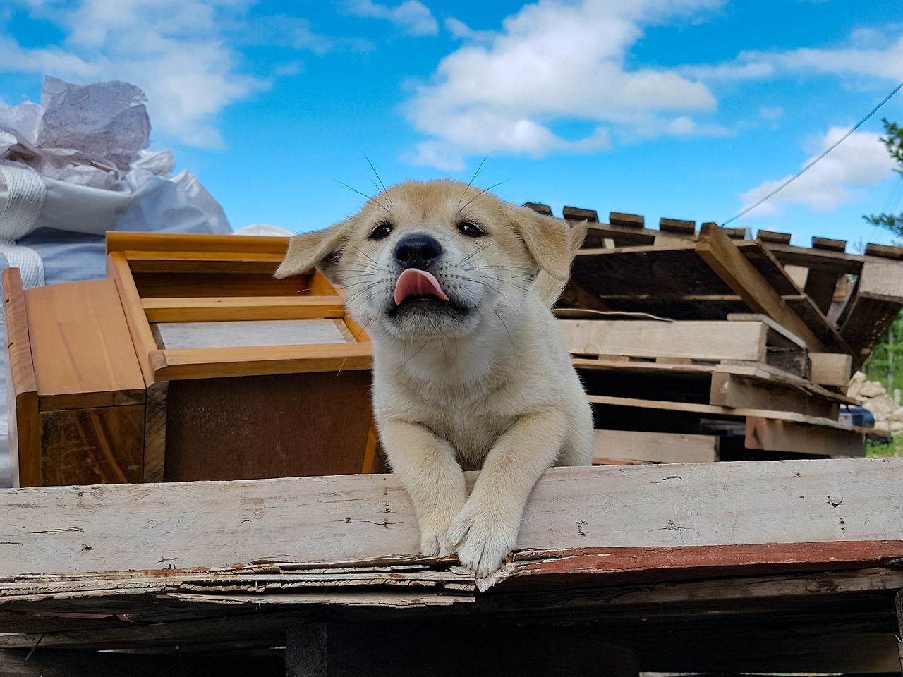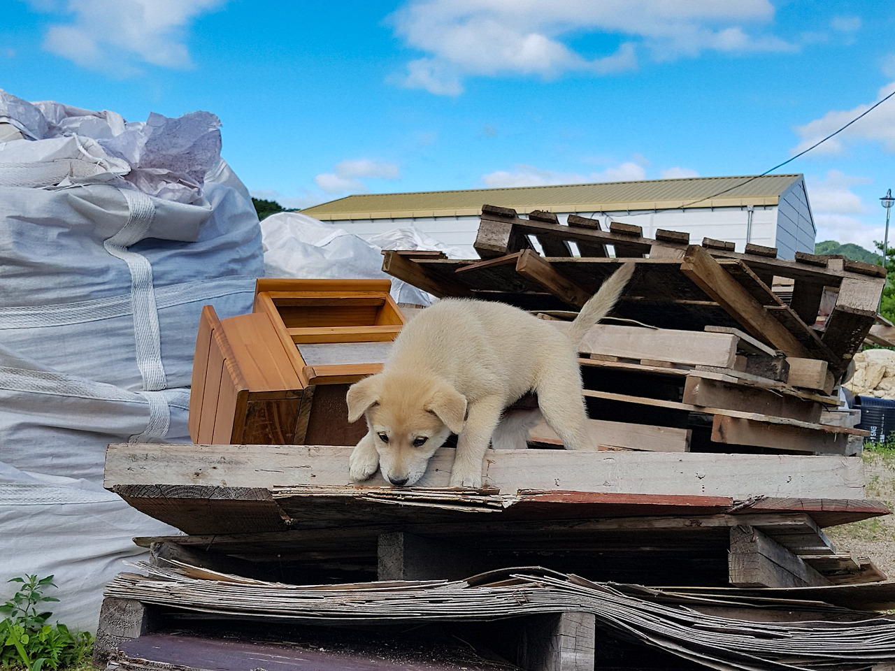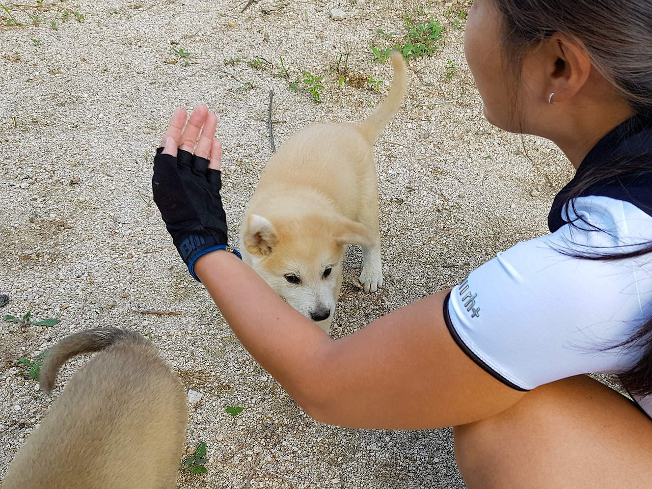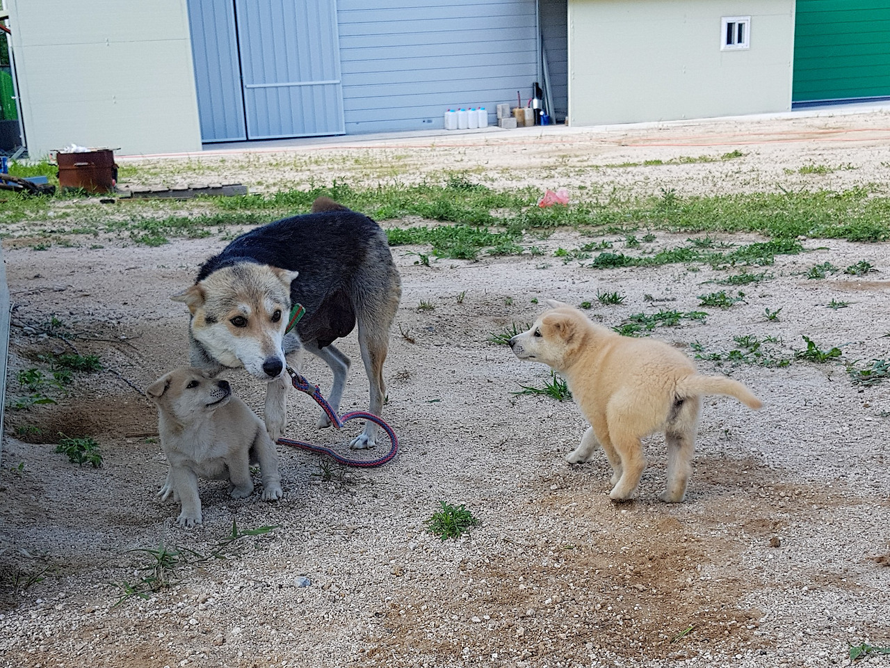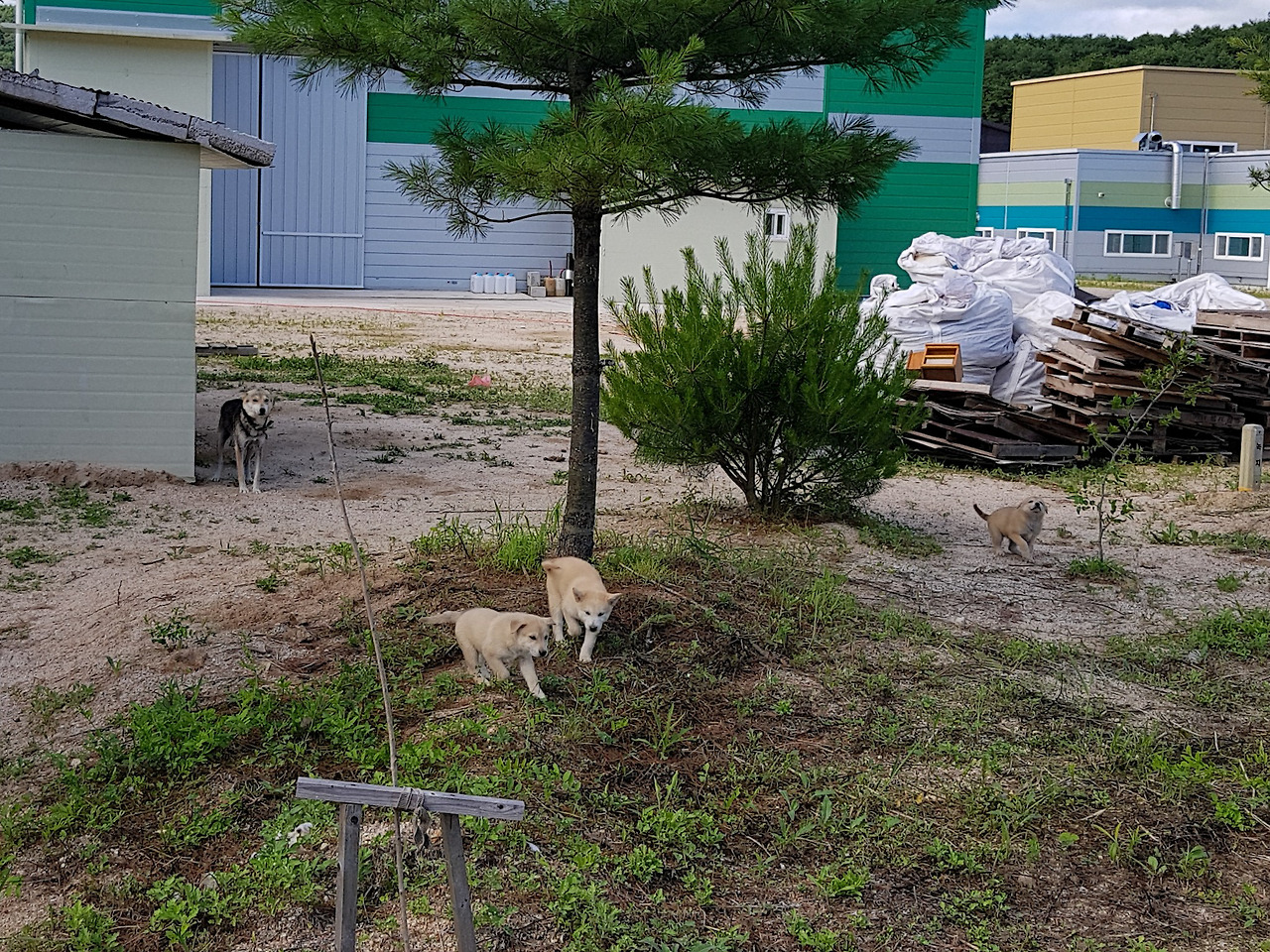 길 옆에 무언가 부스럭거리는 것이 보였는데 똥강아지 세 마리다. 다가갔더니 강아지들도 어미개도 우리를 너무 반가워한다.
