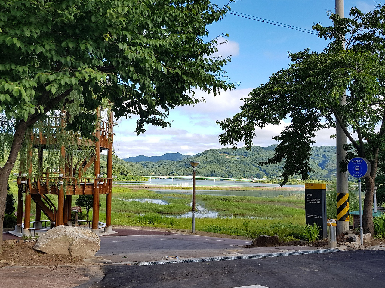 왼쪽의 호수는 파로호의 상류 부분이다. 저 멀리 강 건너편에 보이는 다리는 자전거 보행자 겸용 다리이고 그 다리에서 한반도 모양으로 만든 한반도 섬이 연결된다.