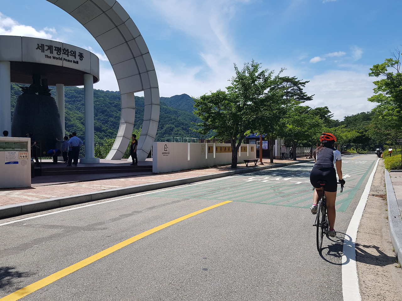 세계 평화의 종이 있는 곳에서 평화의 댐이 보인다. 평화의 댐 상단부의 도로를 따라 화천 방향으로 가면 해산령을 넘게 된다. 이번에는 해산령을 넘지 않고 민간인 통제 구역으로 안동철교를 지나 한묵령을 넘기로 한다. 두타연과 마찬가지로 출입 허가를 받아야 하는데 마침 자전거 가이드가 가능해서 전화로 문의를 해놓았다.