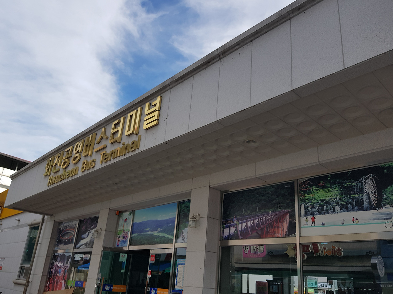 산수화터널에서 내리막길을 쭉 내려가서 화천 읍내에서도 그냥 계속 직진만 하면 된다. 농협이 있는 가장 붐비는 곳에 화천 버스터미널도 있다.