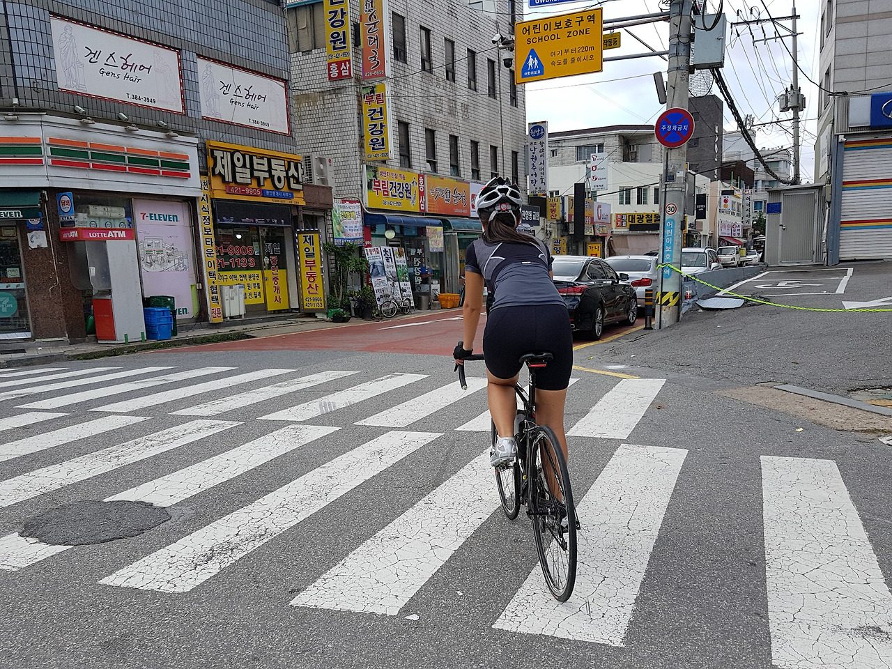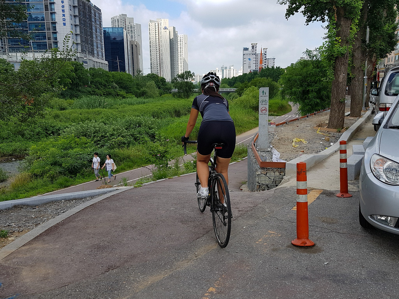 학의천 자전거길로 내려가는 길은 여러 곳이 있지만 주차한 자동차들이 입구를 가리고 있는 경우가 많다.