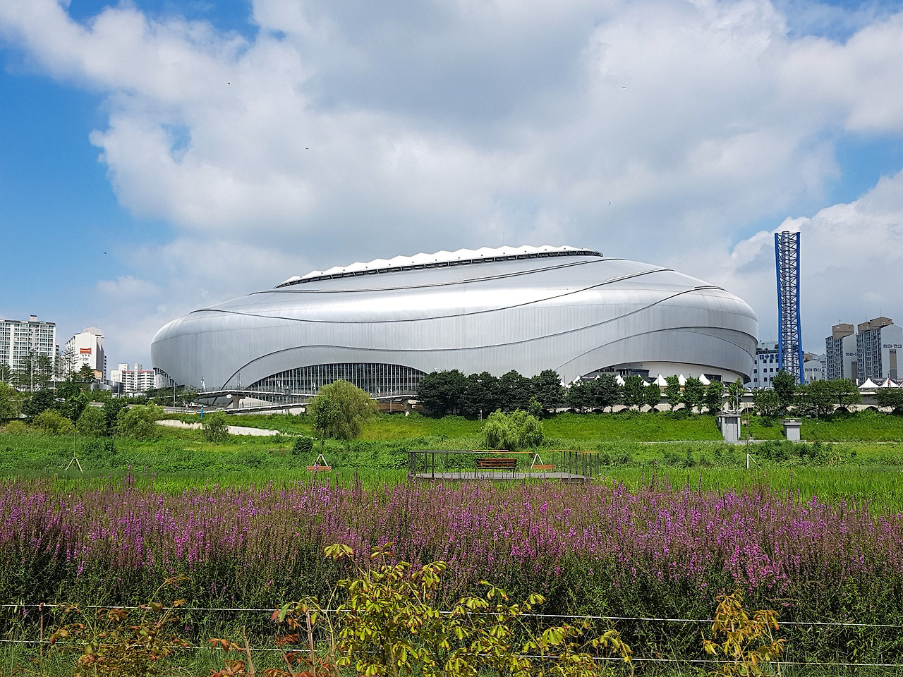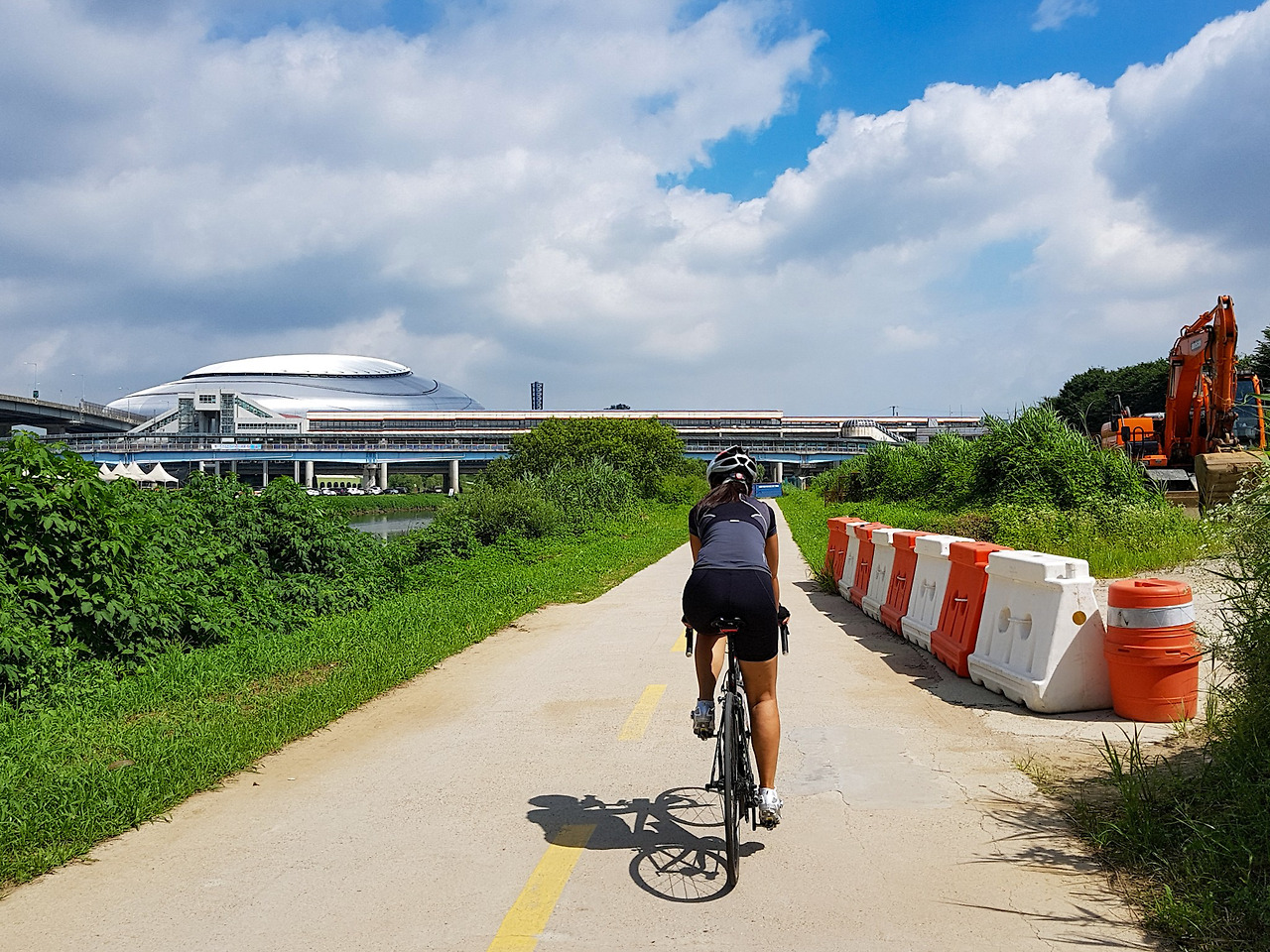 광명역 근처는 뭔가 심심한 구간이다. 봄에 오면 뚝방길 위로 독산역 벚꽃길을 볼 수 있다. 한참 달리다보면 멀리 커다란 조개 같은 건물이 나오는데 국내 최초의 돔 야구장인 고척 스카이돔이다.