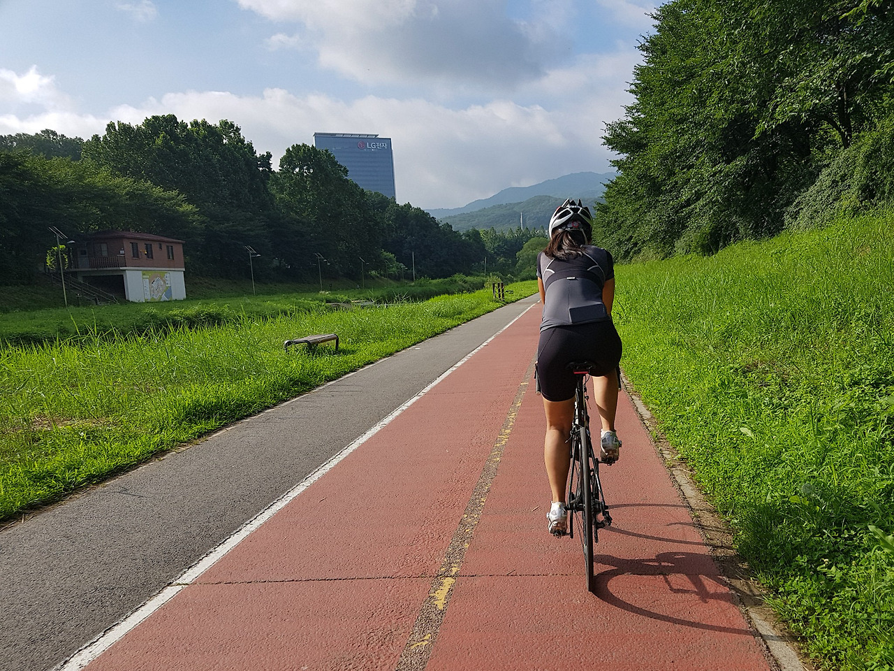 영동2교를 지나면 양재천 자전거길이 합쳐지면서 양방향 통행이 가능하다. 양재천을 따라 달리다가 양재IC 근처의 LG 전자 건물이 보이는 즈음부터는 번잡한 동네를 벗어나 주변 풍경이 한적해진다.